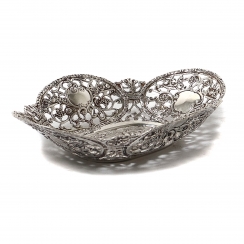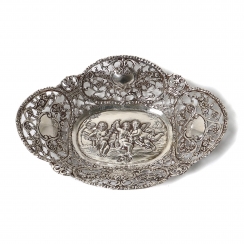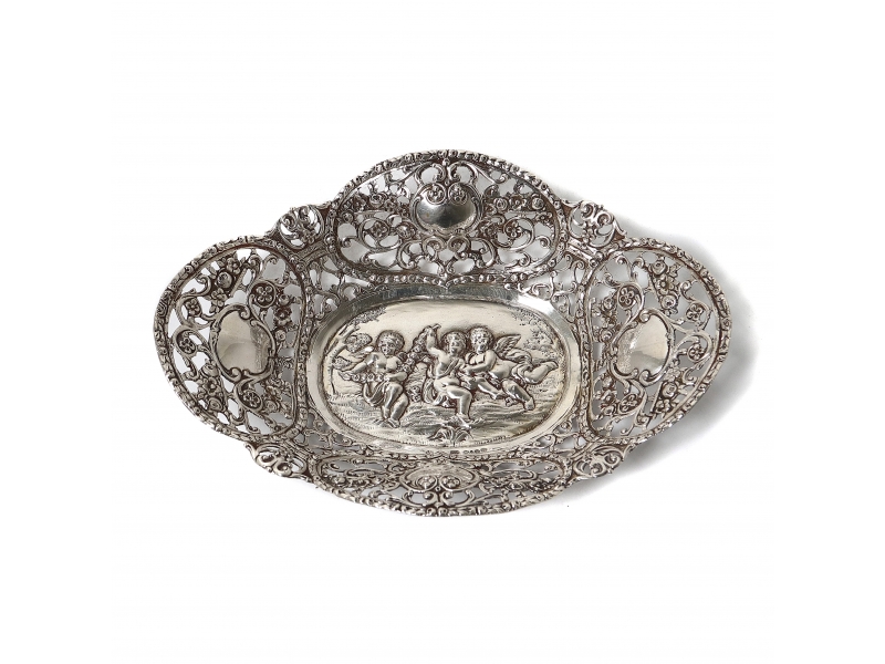 Длина: 20,5 см, ширина: 14,5 см, высота: 4,5 см. Вес: 158 граммов серебра 830 пробы. ========================= Silver open-work bowl with putti.