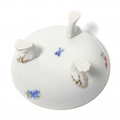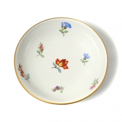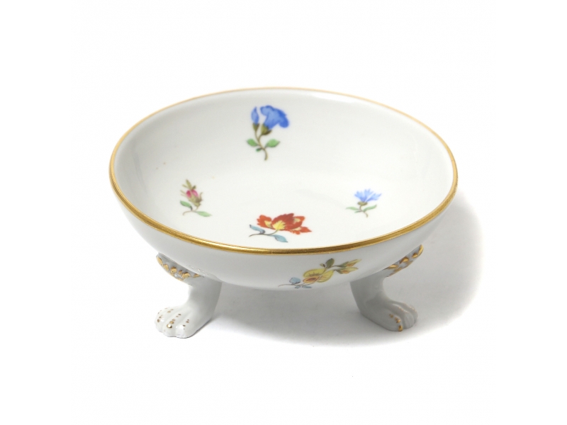 Без сколов, реставраций и повреждений. ============================ Porcelain bowl. This porcelain bowl, with three decorative legs shaped like stylized paws, is made of white porcelain and decorated with gilding along the rim and legs. It is decorated with a painting depicting asymmetrically arranged small wildflowers. Pattern "Strewn Flowers". Hand-painted.