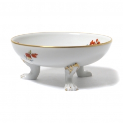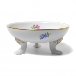 Фарфоровая ваза (икорница). Фарфоровая чаша на трёх фигурных ножках, выполненных в виде стилизованных лап, изготовлена из белого фарфора и украшена золочением по краю и на ножках. Декорирована росписью с изображением асимметрично расположенных мелких полевых цветов. Дизайн "Рассыпанные цветы". Ручная роспись.