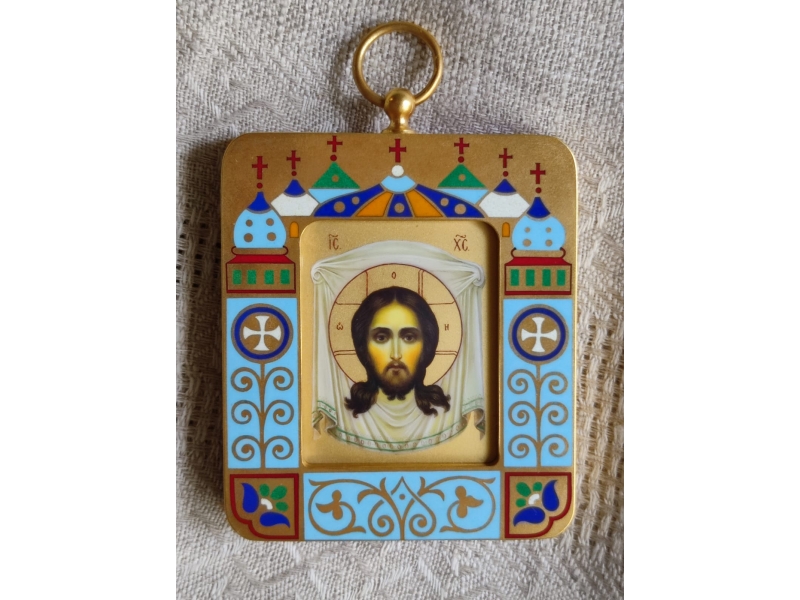 Икона Спас Нерукотворный в окладе. Размеры без кольца 5,8 х 6,5 х 1 см Икона Спаса Нерукотворного в окладе. Икона написана на позолоченной латуни масляными красками. Образ украшен окладом в стиле модерн. Декор выполнен в технике гравировки и запильной эмали (горячей). Кипарисовая доска, подбитая бархатом, использована в качестве конструктивного элемента. Футляр 11,2 х 12,8 х 3 см