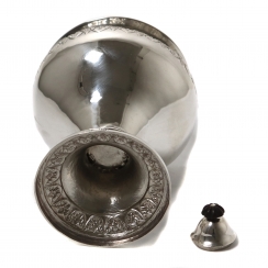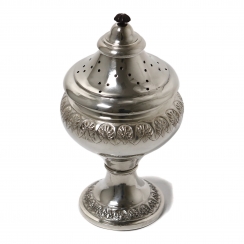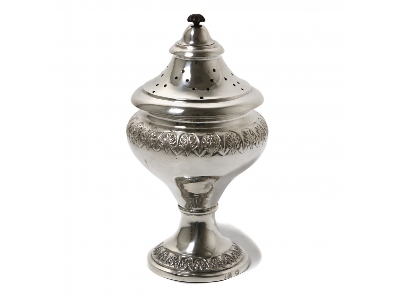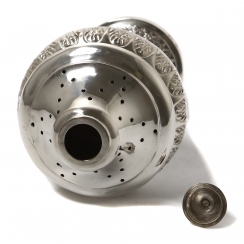 Серебряная ёмкость для сахарной пудры, декорирована растительным орнаментом.