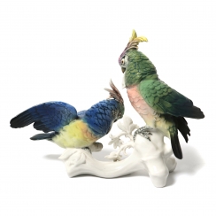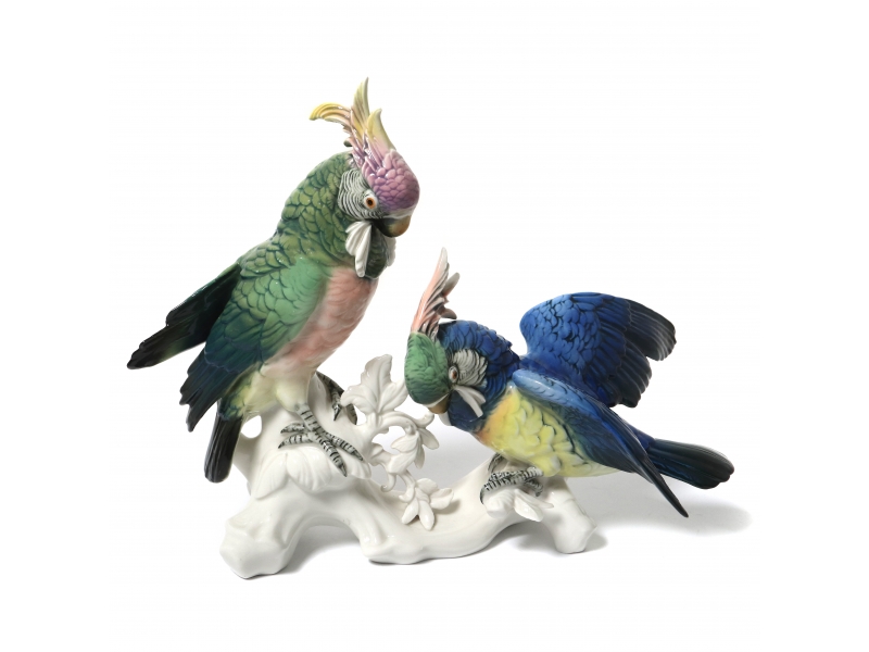 Фарфоровая фигура (статуэтка) "Пара попугаев какаду". Ручная подглазурная роспись.