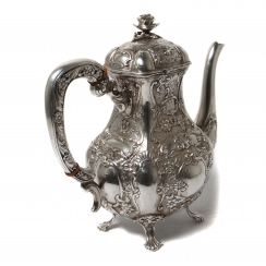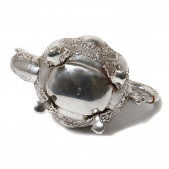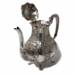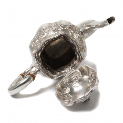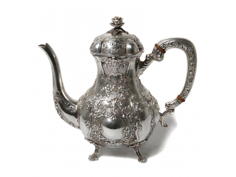Height of the tea pot on the grip on the lid: 22.5 cm. Volume: 1100 ml. Weight: 937 grams of silver 830 fineness.