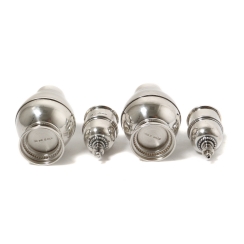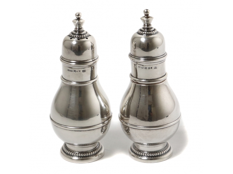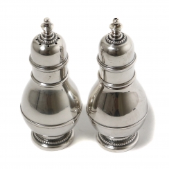 Высота: 9,6 см, диаметр основания: 2,9 см, диаметр горла: 2 см. Общий вес: 66 граммов серебра 830 пробы. =============================== Silver salt and pepper shaker.