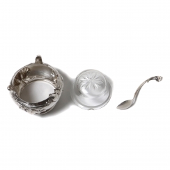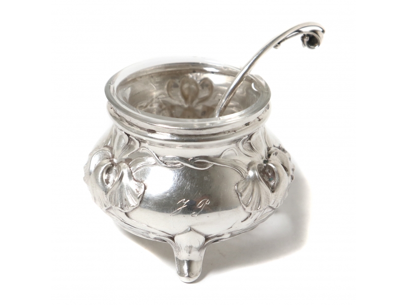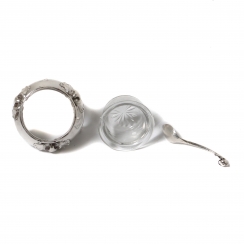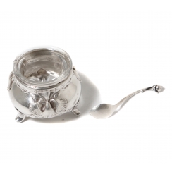 Высота солонки 4,5 см, диаметр верха 4,2 смДлина ложки 6,2 смНа краю стеклянной вставки небольшой скол