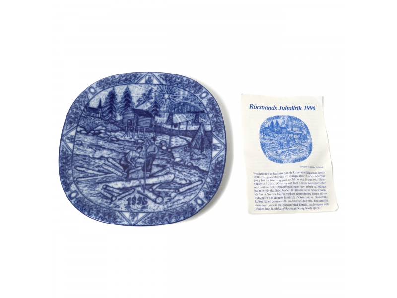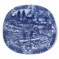 Коллекционная фарфоровая тарелка 1996 года из серии "Рождество" с мотивом из знаменитой книги Сельмы Лагерлёф «Чудесное путешествие Нильса Хольгерссона с дикими гусями по Швеции». На тарелке 1996 года изображена сцена сплава леса по реке (традиционный шведский промысел).