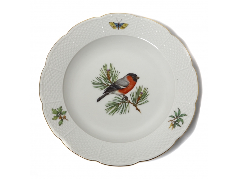 Без сколов, реставраций и повреждений. ============================ Porcelain plate. Polychrome hand-painted in a naturalistic style. The central part depicts a bullfinch perched on a coniferous branch. The composition includes an image of a butterfly. The rim is decorated with a relief ornament imitating a braided pattern. The edge is accented with a fine gilded line. Hand-painted.