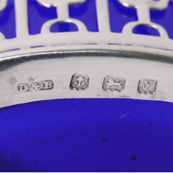 Небольшая вмятинка на ребре основания. =========================== Silver open-work salt cellar with cobalt insert.