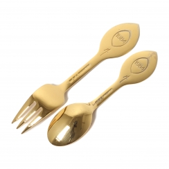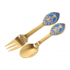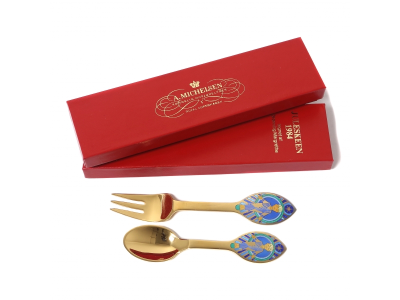 Годовые чайная ложка и десертная вилка "Младенец Иисус". Серебро, позолота, эмаль. В оригинальной коробке.