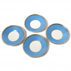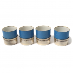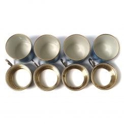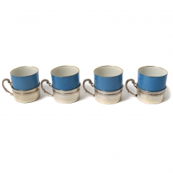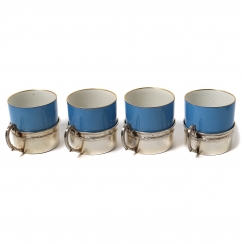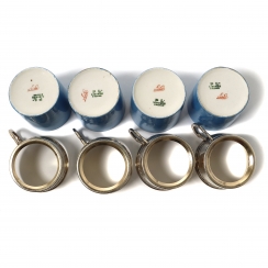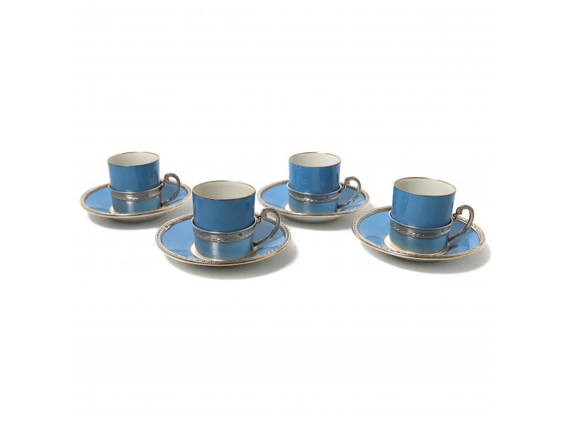 Кофейные чашки в серебряных подставках на блюдцах с серебряными ободками, 4 пары (8 предметов), Франция, Лимож Вес серебряных подставок 94 гр, 950 пр Высота чашек 6 см, диаметр верха 5,5 см Диаметр блюдец 12,5 см, высота 2,2 см на боках фарфоровых вставок есть несколько мелких сколов глазури (от трения с краем подставки), они не видны, если вставка в подстаканнике на блюдцах несколько царапинок и потертостей