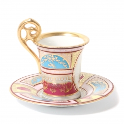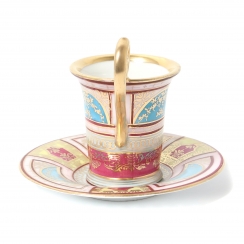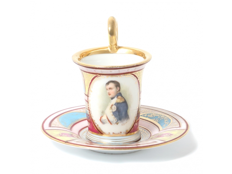 Фарфоровая кофейная пара: чашка с поясным портретом Наполеона Бонапарта и блюдце. Ручная роспись, роспись золотом.