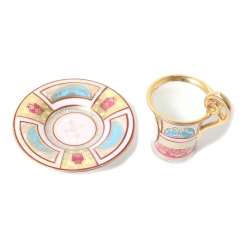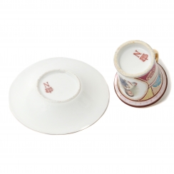 Height of the cup rim: 6.2 cm, top diameter: 5.5 cm. Saucer diameter: 10.6 cm, height: 1.7 cm.