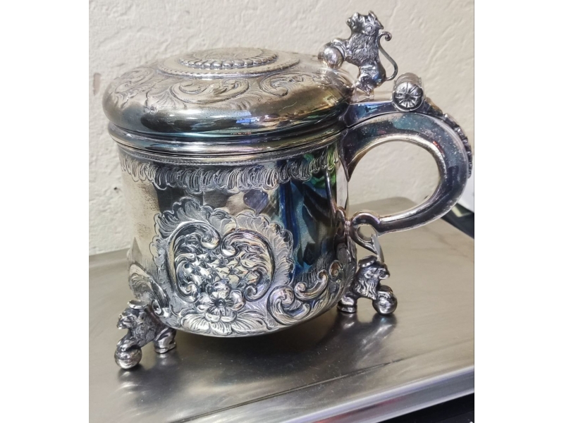 395401 - Кружка с откидной крышкой, Дания, 1951 год, 1025 гр, 826 пр, высота по верх крышки 16,5 см, диаметр верха 14,3 см