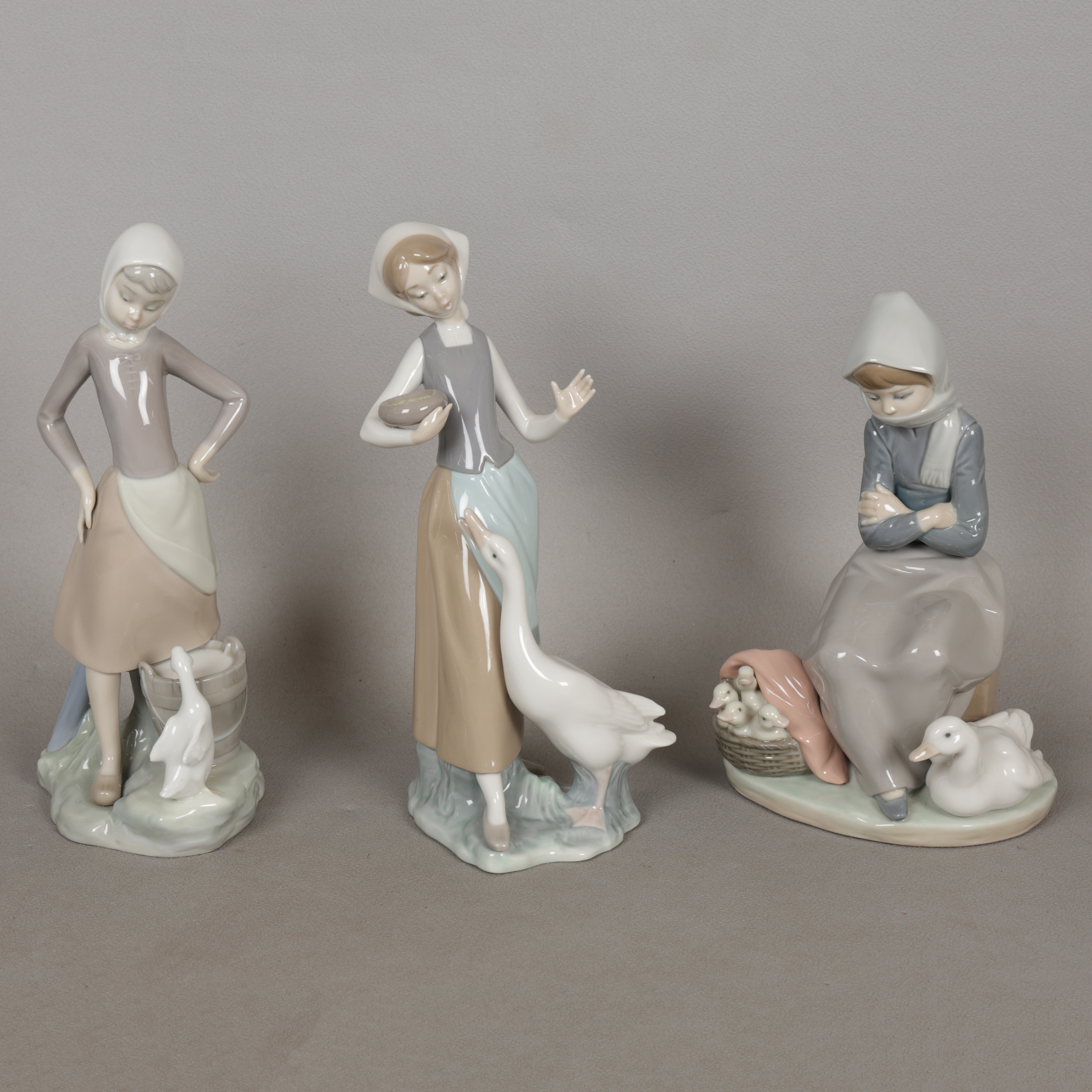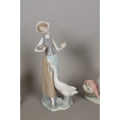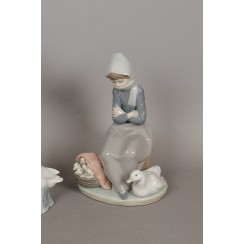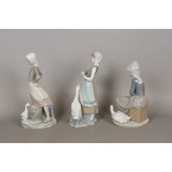 356539 - Девочка с уткой и утятами в корзине, высота 20,5 см, основание 12,8 х 10,3 см, Испания, Lladro 392044 - Девочка с утенком, пьющим из ведра молоко, высота 24 см, основание 11 х 9 см, Испания, Lladro 319286 - Девочка с гусем, высота 23 см, основание 9 х 8 см, Испания, Lladro