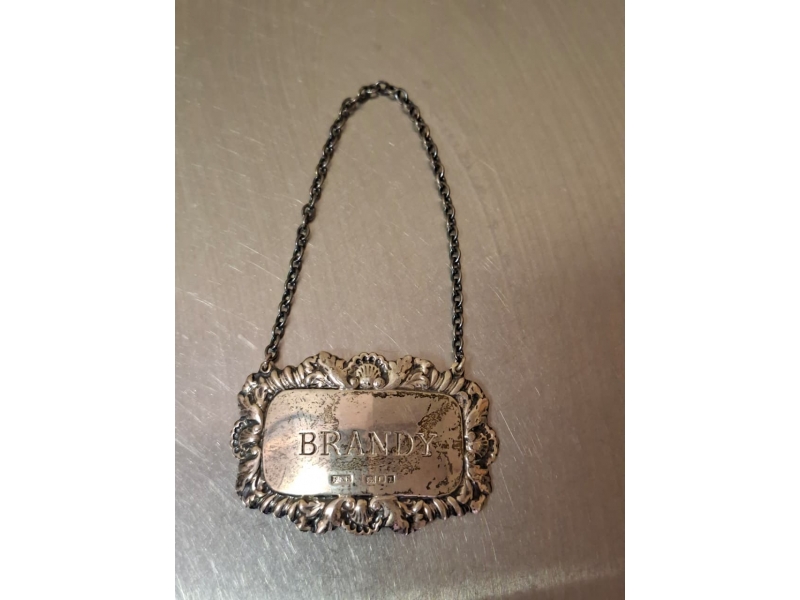 397035 - Серебряная табличка на бутылку "Brandy". Англия, 14 гр, 925 пр, 6 х 4 см, длина цепочки 14 см