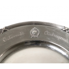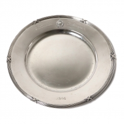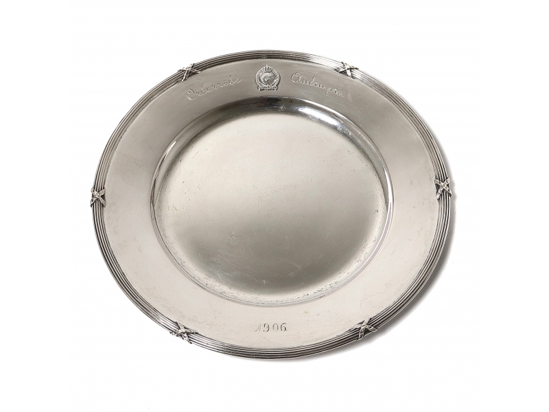 Гравировка. Был вторым призом за конные соревнования 1906 года. Накладку и гравировку за дополнительную плату могу удалить. ============================= Silver coaster or tray with the coat of arms of Sweden (three crowns).
