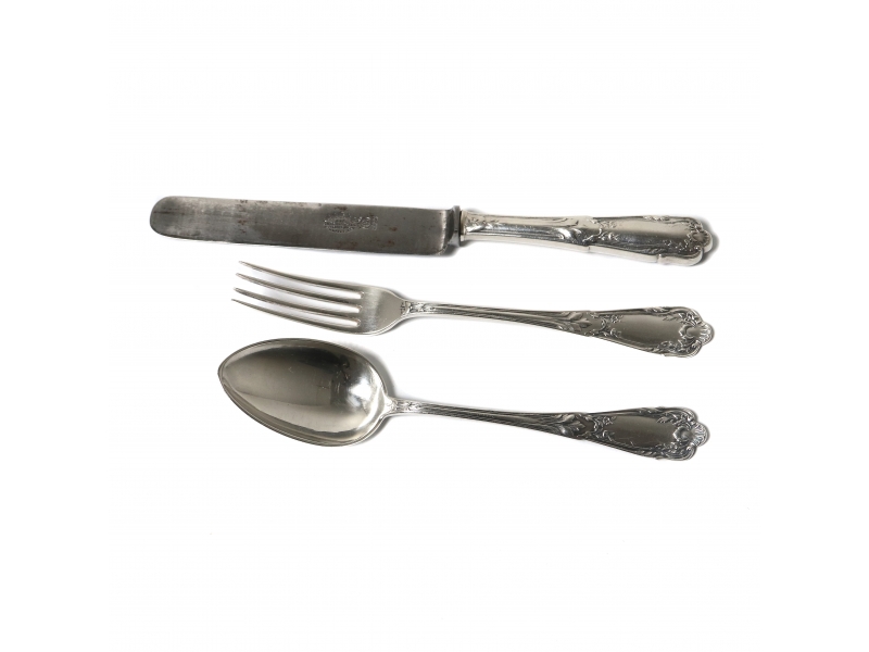 На лезвиях ножей стоит клеймо "Т-во производства стальных изделий Л. и А. Завьяловых в Ворсми". ============================== Small silver cutlery set for one person (Egoiste), 3 items.