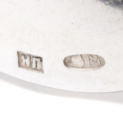 Трехзначное пробирное российско-советское клеймо в овале 1908-1926 гг. - "женская голова в кокошнике, обращенная вправо" с литерой "Δ" (дельта) и цифрой "84", где: "женская голова в кокошнике, обращенная вправо" - знак удостоверения; "Δ" (дельта) - шифр Московского пробирного управления; цифра "84" удостоверяет, что изделие выполнено из серебра 84 золотниковой пробы.