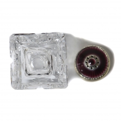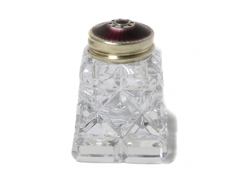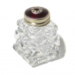 На гранях стекла несколько микросколов. =========================== Salt shaker. Glass, sterling silver of 925 fineness, purple guillash enamel.