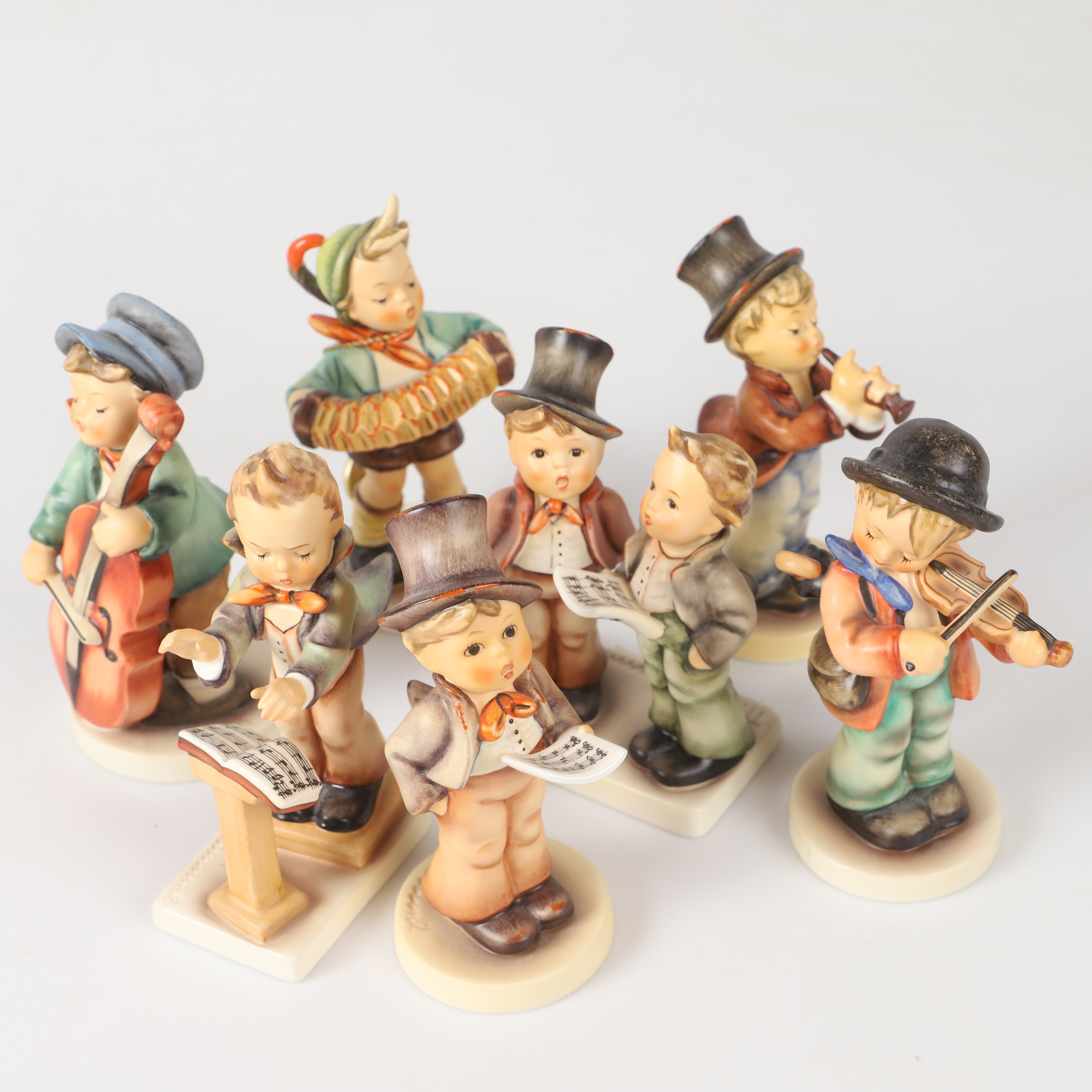 379133 - Маленький скрипач, высота 12,5 см, диаметр основания 5,5 см, Германия, Goebel 361969 - Мальчик с гармонью, высота 13,3 см, диаметр основания 5,7 см, HUM_185 282672 - Мальчик – виолончелист, высота 13 см, диаметр основания 6,8 см, HUM_186 331507 - Мальчик - дирижёр, высота 13 см, основание 6,6 х 4,5 см, HUM_129 254279 - Мальчик, играющий на дудке, высота 12,5 см, диаметр основания 5,4 см, HUM_85 321428 - Два поющих мальчика, высота 12,5 см, основание 7,8 х 5 см, HUM_130 (?) 388767 - Мальчик в цилиндре с нотами, высота 12,8 см, диаметр основания 5,5 см, HUM_131