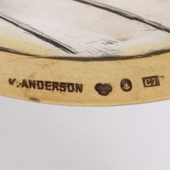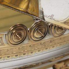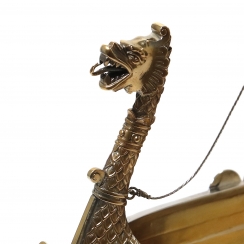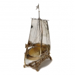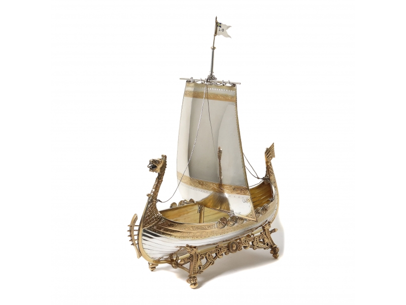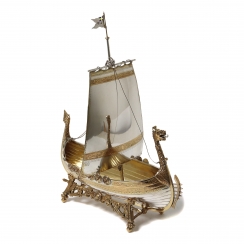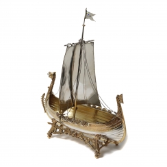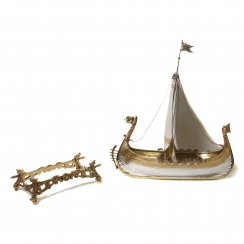 Серебряная модель Кнорра (деревянного корабля викингов) на подставке, позолота. Детализированная миниатюра судна викингов с характерным изогнутым штевнем в виде головы дракона. Корпус корабля украшен рядом круглых щитов по бортам и установлен на изящную фигурную подставку, а его центральным элементом является широкий парус с тонкой гравировкой, увенчанный мачтой с эмалевым флагом Швеции.
