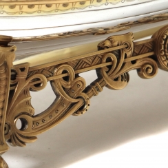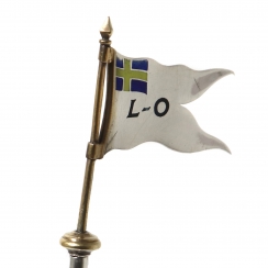 Максимальная высота: 41 см, длина: 34 см, ширина: 18 см. Общий вес: 1648 граммов, серебро 830 пробы. ============================= Silver Knorr (a wooden Viking ship) model on a stand, gilding. The figurine is crafted in the Old Norse style, with a distinctive dragon head on the prow, shields on the sides, and a sail. Details: At the top of the mast is the Swedish flag, painted in blue and yellow enamel, with the initials "L-O." Construction: The ship stands on a separate stand.