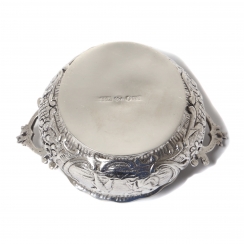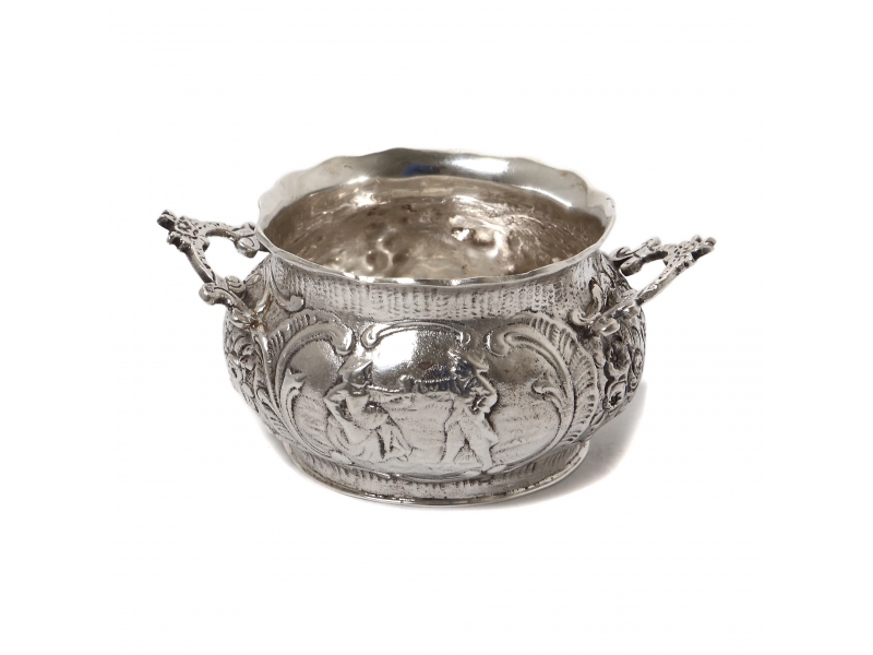 Серебряная сахарница с двумя ручками, декорирована сюжетной миниатюрой и цветочным узором.