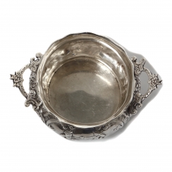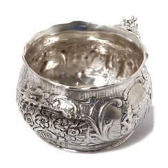 Высота по край: 4,8 см, диаметр верха: 6,5 см. Вес: 145 граммов серебра 830 пробы. ============================ Silver sugar bowl with two handles, decorated with a miniature story and a floral pattern.