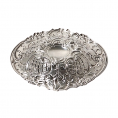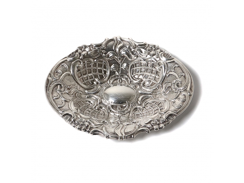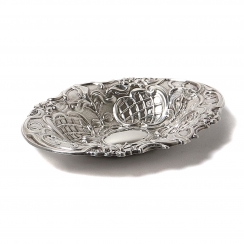 Размеры: 11,7 х 9 х 1,8 см. Вес: 29 граммов серебра 925 пробы. =============================== Silver bowl on legs, decorated with a relief floral pattern. Designer Pedro Duran Morales (1860-1938).