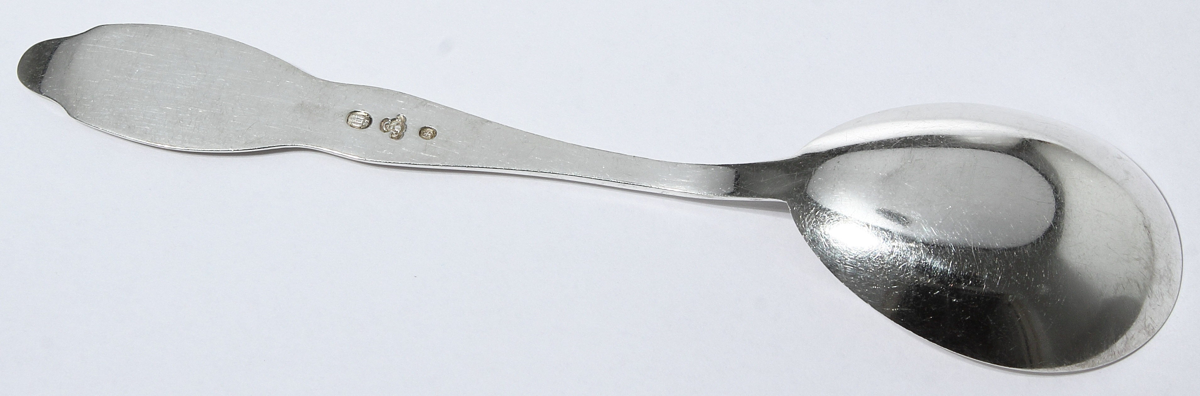 Клеймо мастерской.Датское пробирное клеймо 1932 года для серебряных изделий с изображением трех башен,под которыми размещены две последние цифры года клеймения. С 1608 по 1893 год такое клеймоставилось только на изделиях, произведенных в Копенгагене. С 1893 года это клеймо стало датскимобщенациональным клеймом, гарантирующим содержание серебра в клейменом изделии не ниже826/1000 (826 пробы), и использовалось до 1977 года.ядом с «Тремя башнями» располагается клеймо в виде инициалов начальника пробирной палаты(Stadtsguardien) времени клеймения. На данном изделии это «JS» Jens Sigsgaard, руководительпробирной палаты Дании с 1932 по 1960 год.