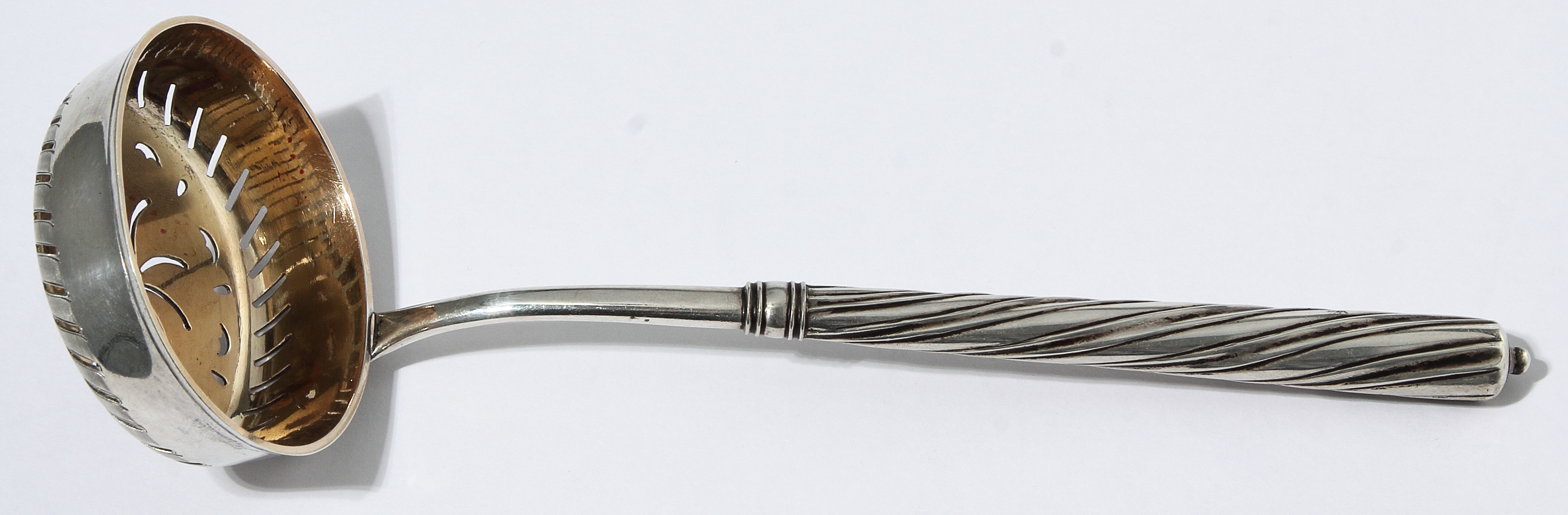 В данном лоте предлагается старинный серебряный половник с перфорированным черпаком.