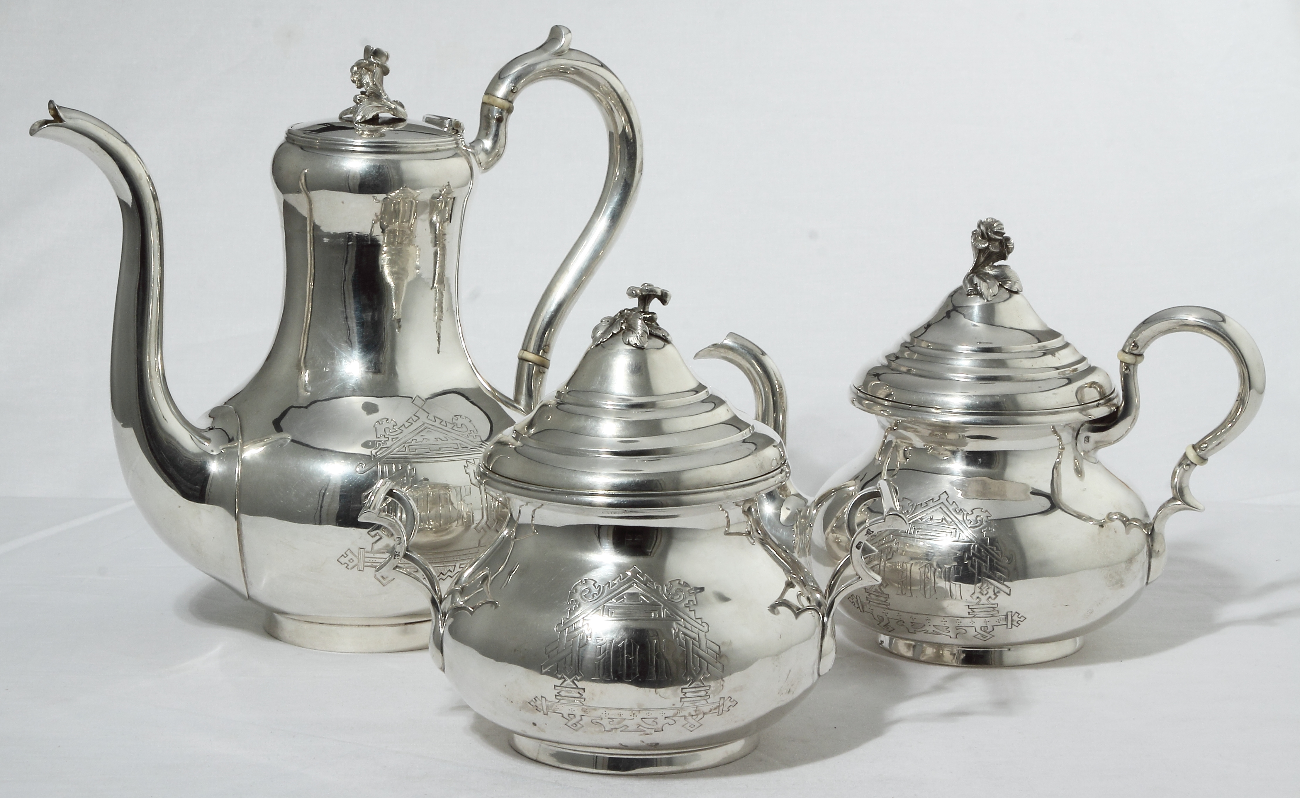 Общий вес изделий – 1735 граммов серебра 84 пробы (= 875 метрической пробе). С выгравированными инициалами в картушах.