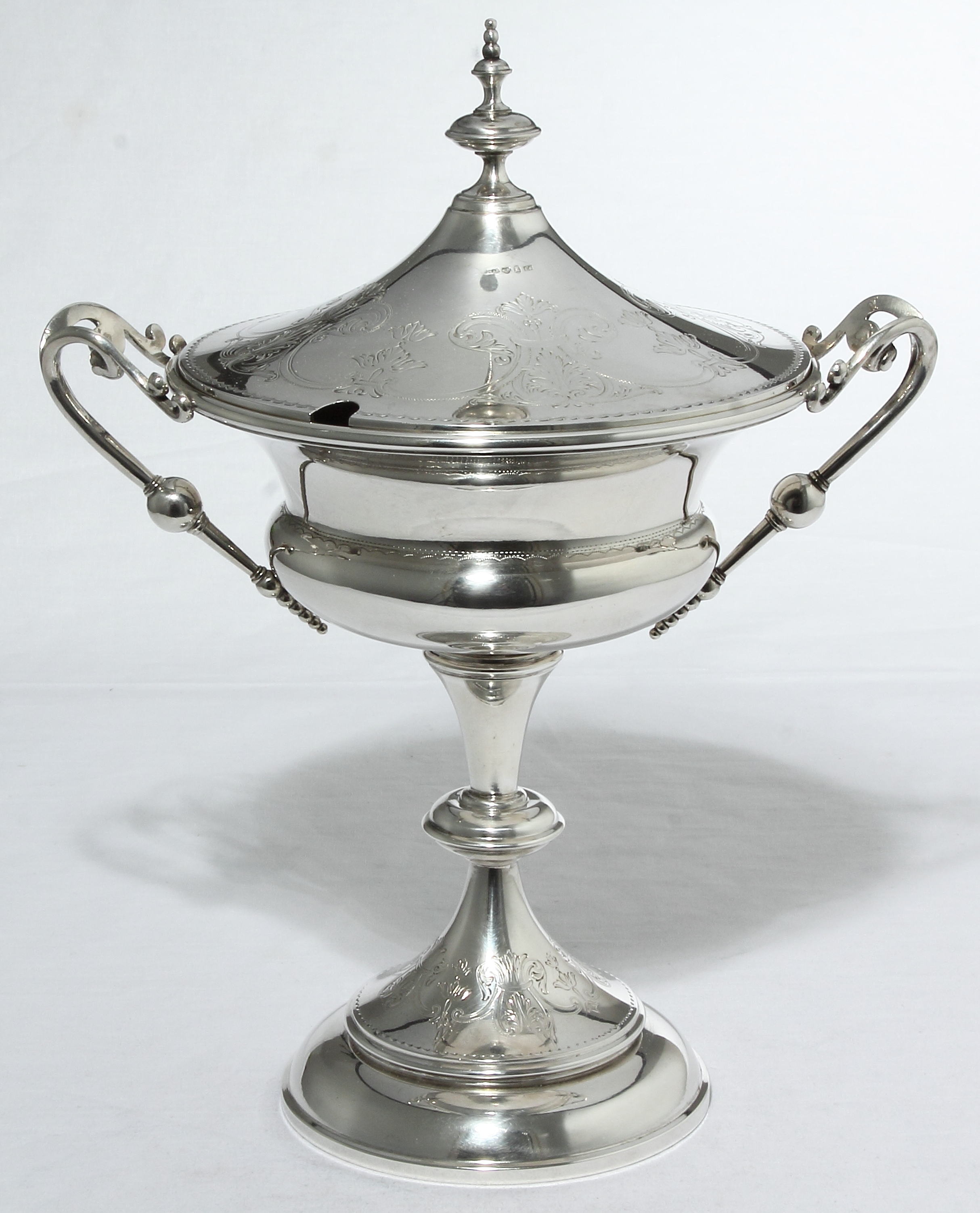 В данном лоте предлагается старинная большая серебряная сахарница с крышкой.