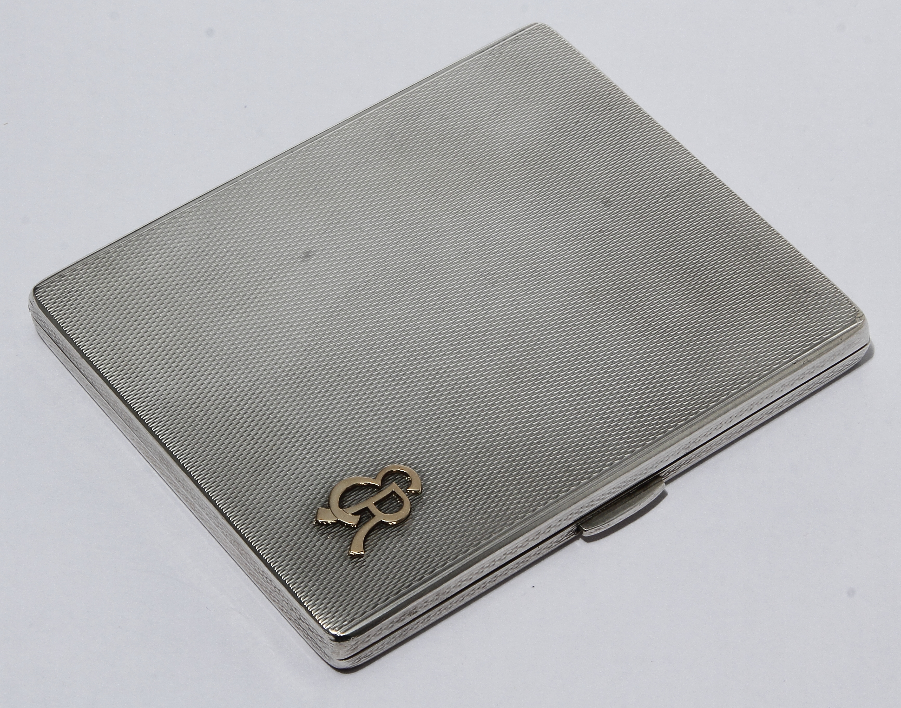 В данном лоте предлагается серебряный портсигар.Поверхность изделия декорирована мелким рифлением.На верхней крышке золотая накладка в виде инициалов "ER".Дания, ХХ век.Длина - 9,9см, ширина - 8см, толщина - 0,8см.Вес - 123 грамма серебра 830 пробы.Без гравировок.Без вмятин, крупных царапин и иных существенных повреждений.Петли целые, без ремонта.Замок-защелка полностью в рабочем состоянии.Состояние смотрите на фотографиях. Если Вам что-то не видно на фотографиях, напишите,воспользовавшись опцией "Обсудить лот", выложу более подробные фотографии.Клеймо мастерской.Цифровое клеймо "830S" удостоверяет, что изделие выполнено из серебра 830 пробы.