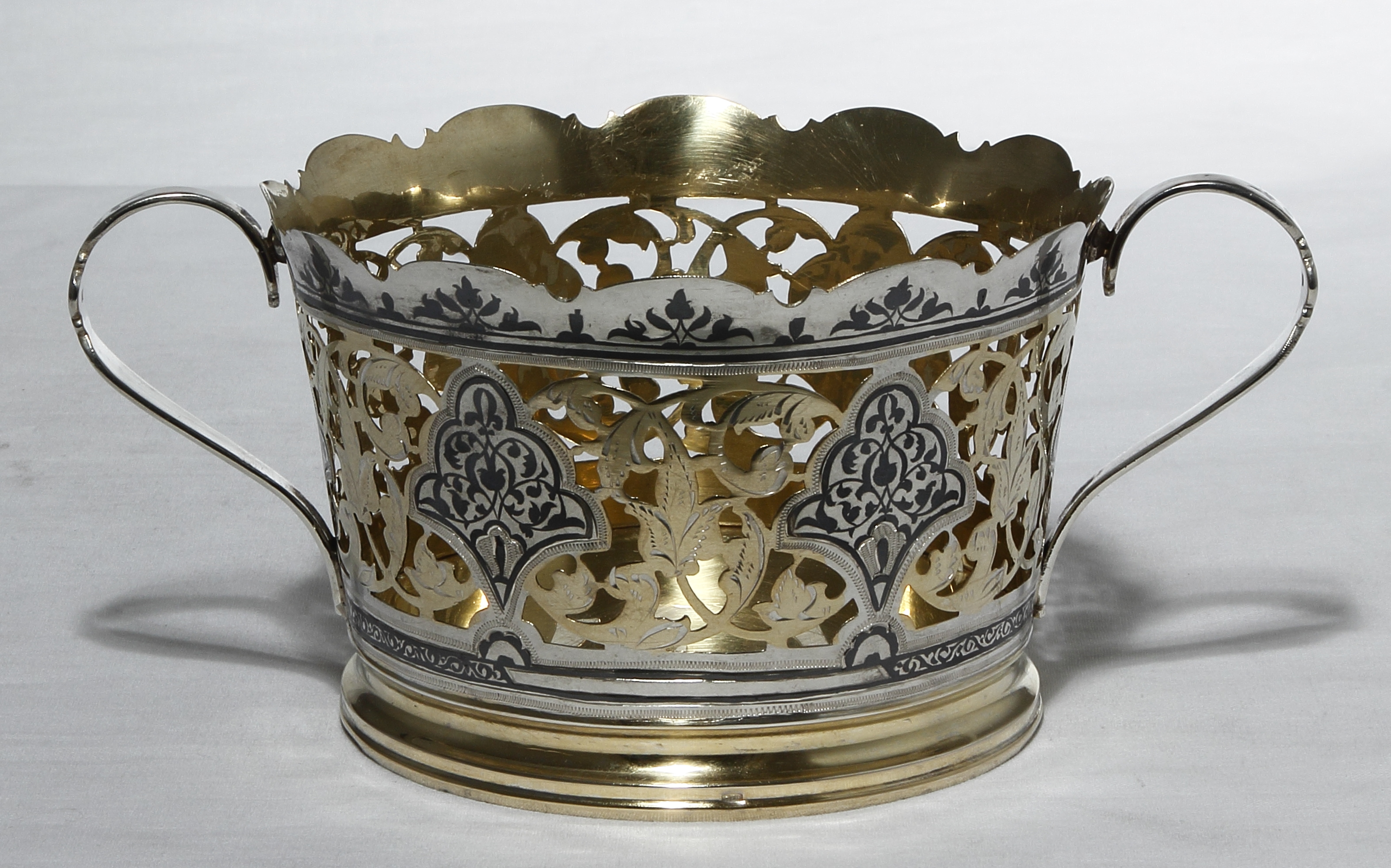 Бока вазочки украшены прорезным узором с чернением.