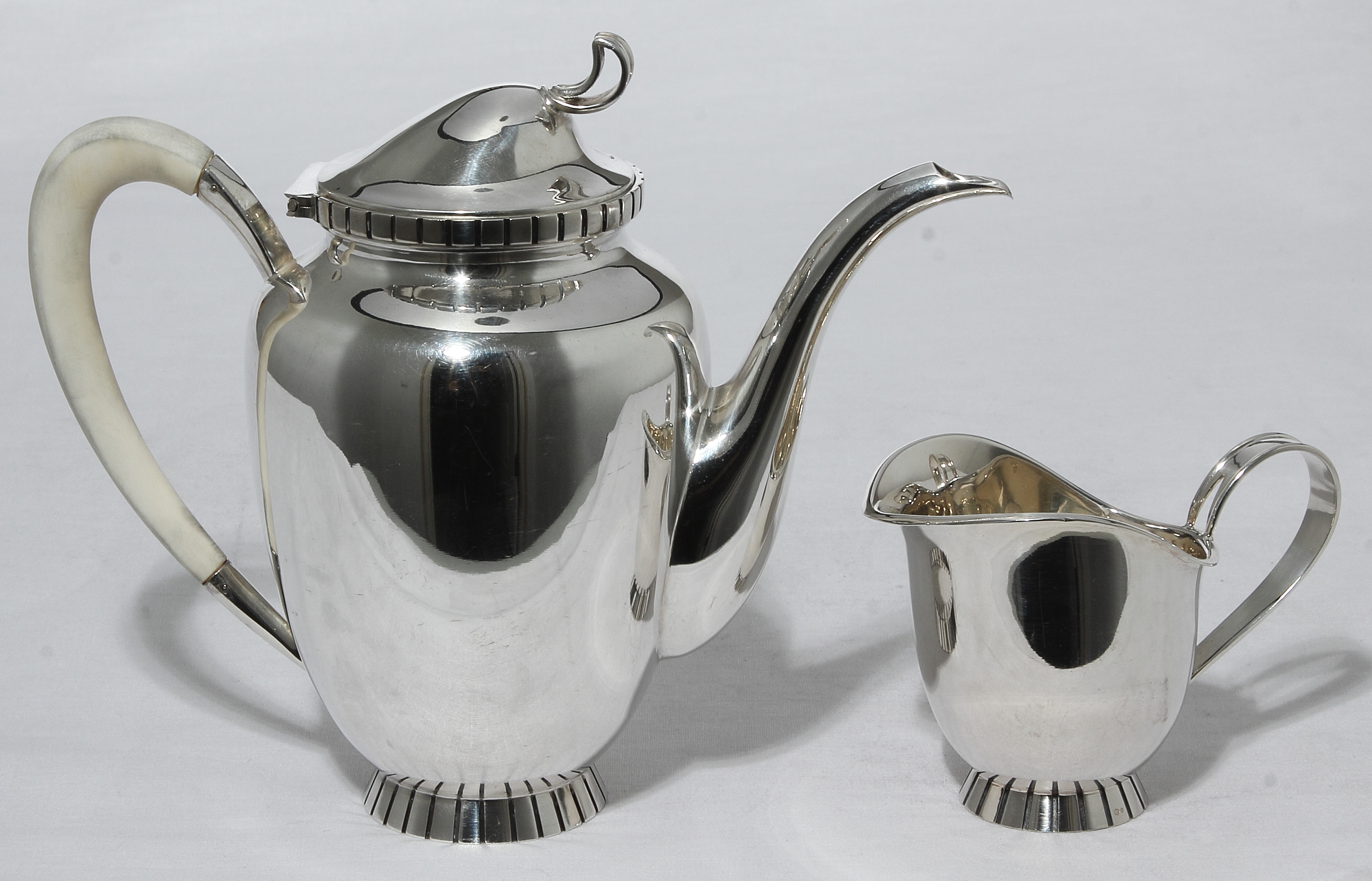 В данном лоте предлагаются серебряные чайник и молочник, выполненные в стиле арт нуво.