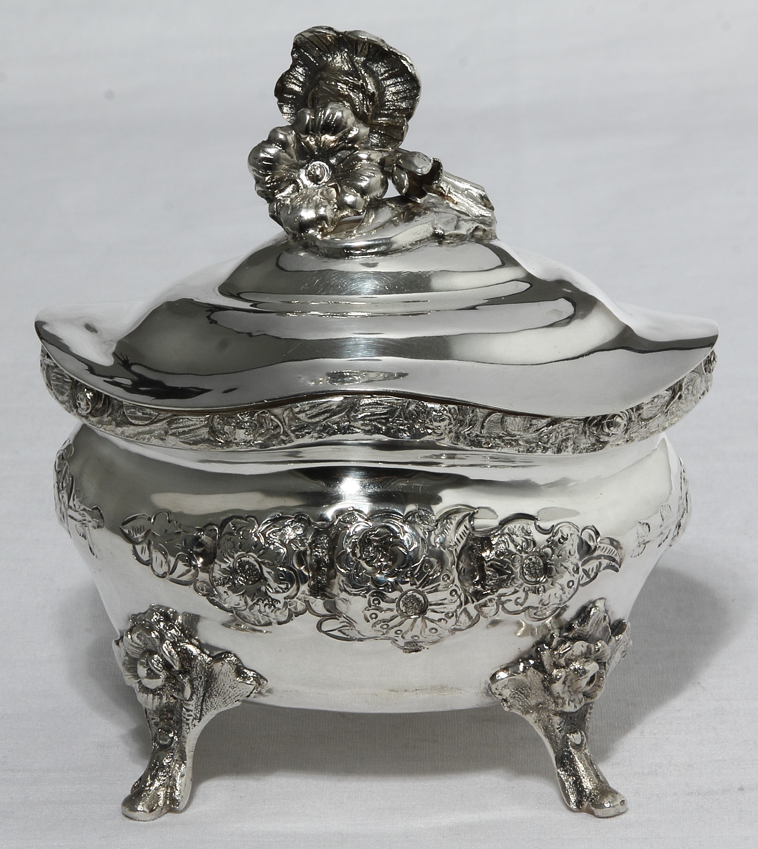 Сахарница установлена на ножки, в местах крепления декорированные рельефными пальметтами.