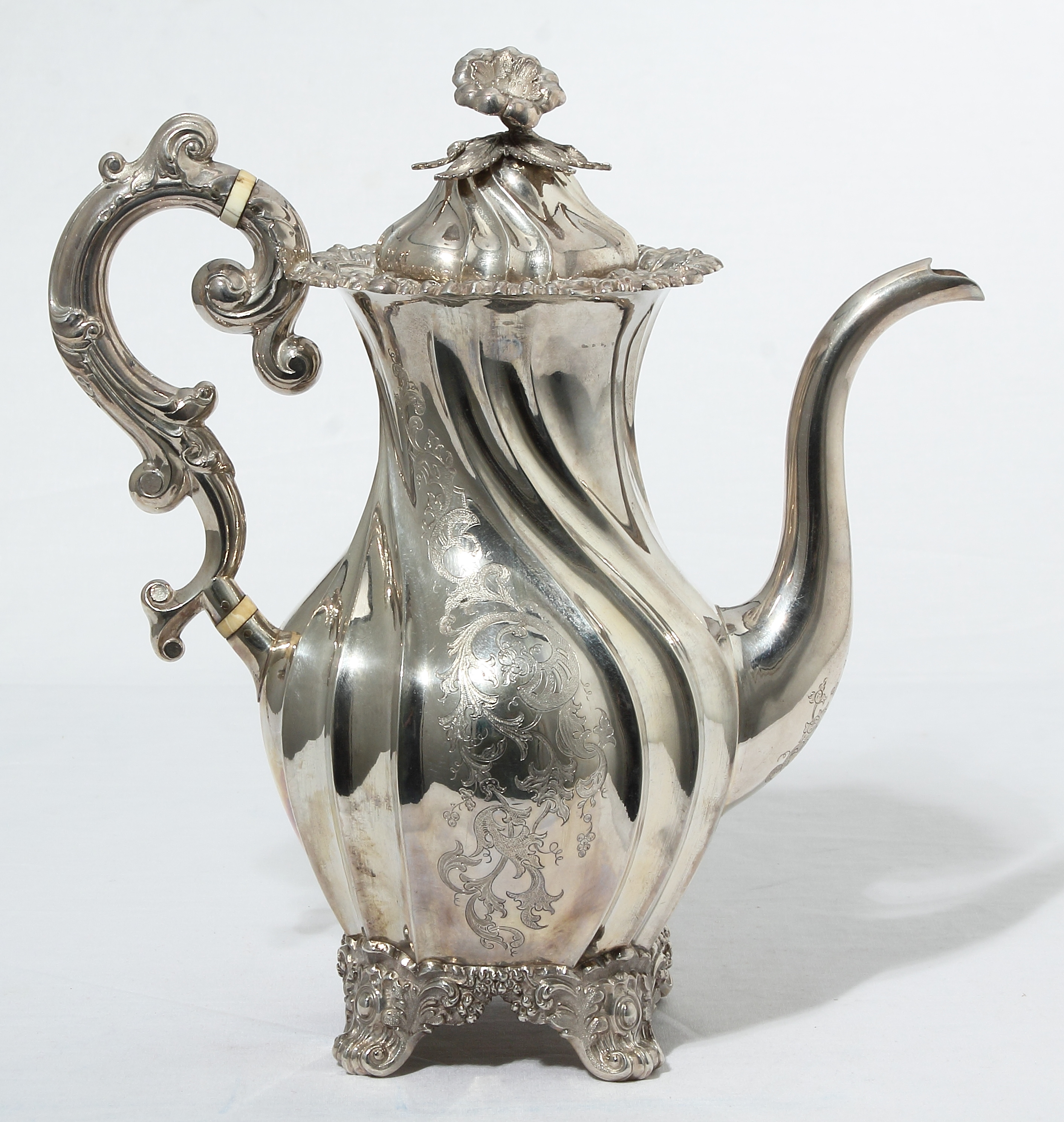 В данном лоте предлагается красивый старинный серебряный кофейник, выполненный в стиле рококо.
