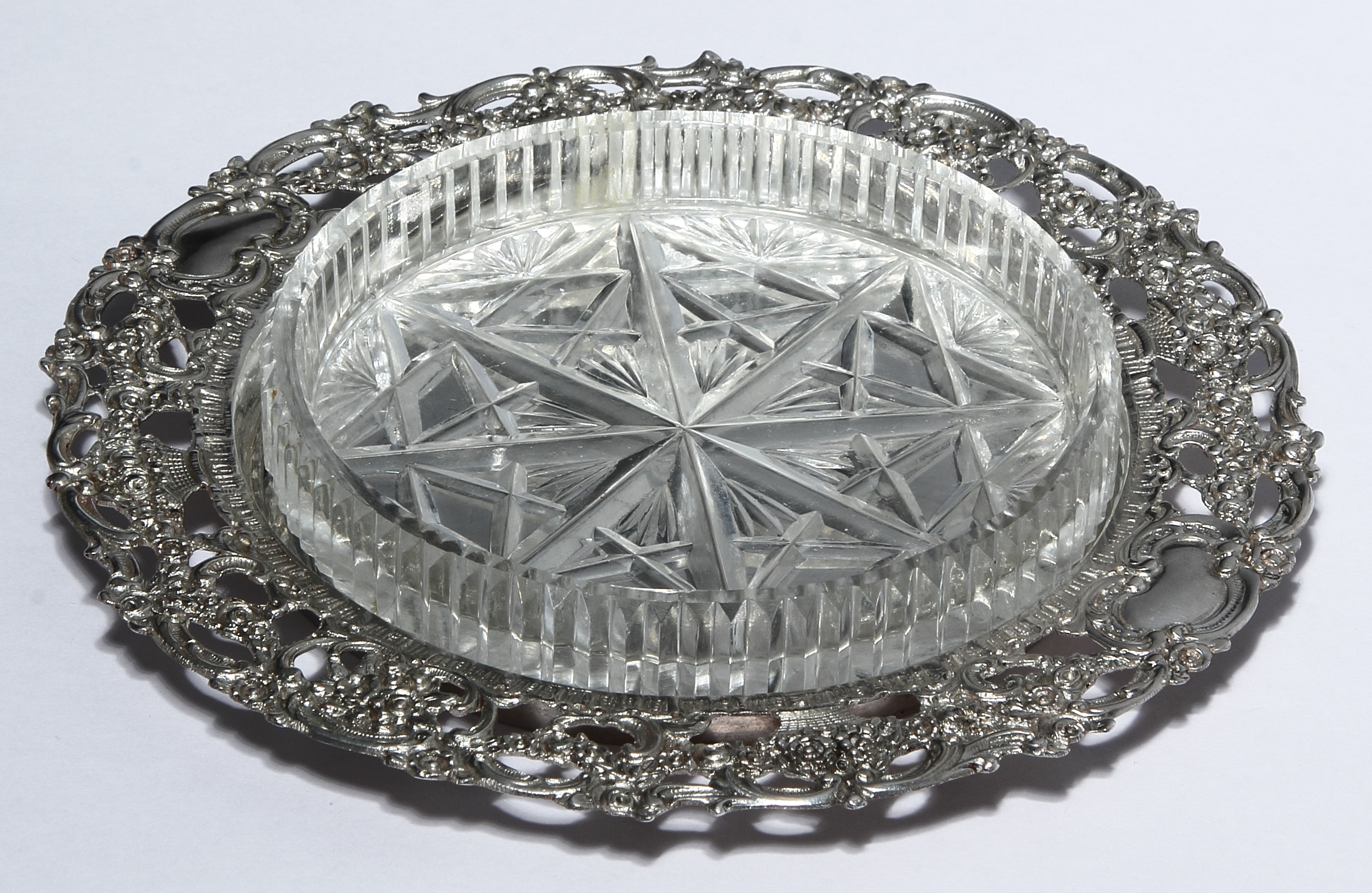 Поля серебряной подставки декорированы богатым прорезным узором из пышных корзин с