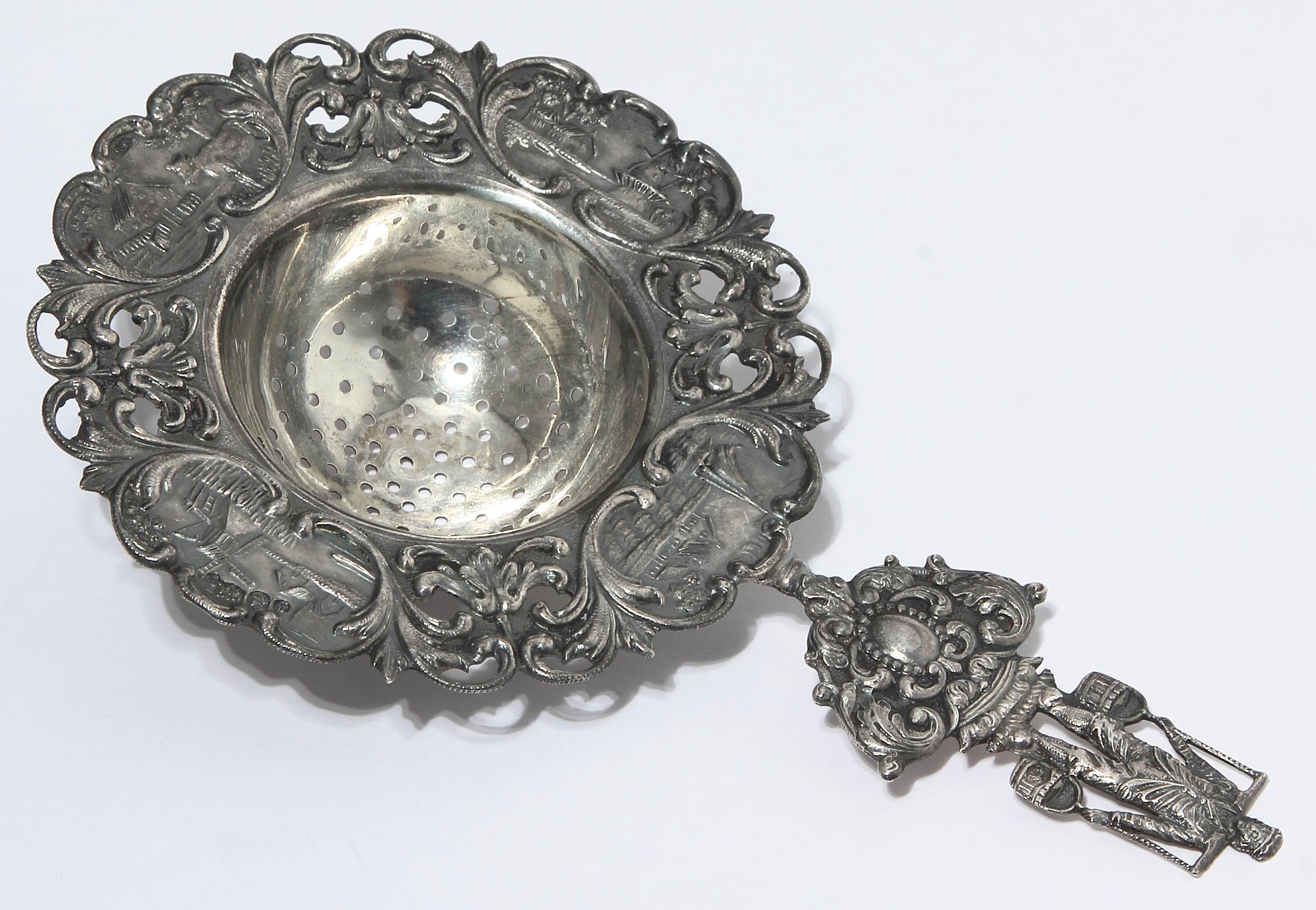 Широкие поля ситечка богато декорированы прорезным узором из резных листьев аканта.
