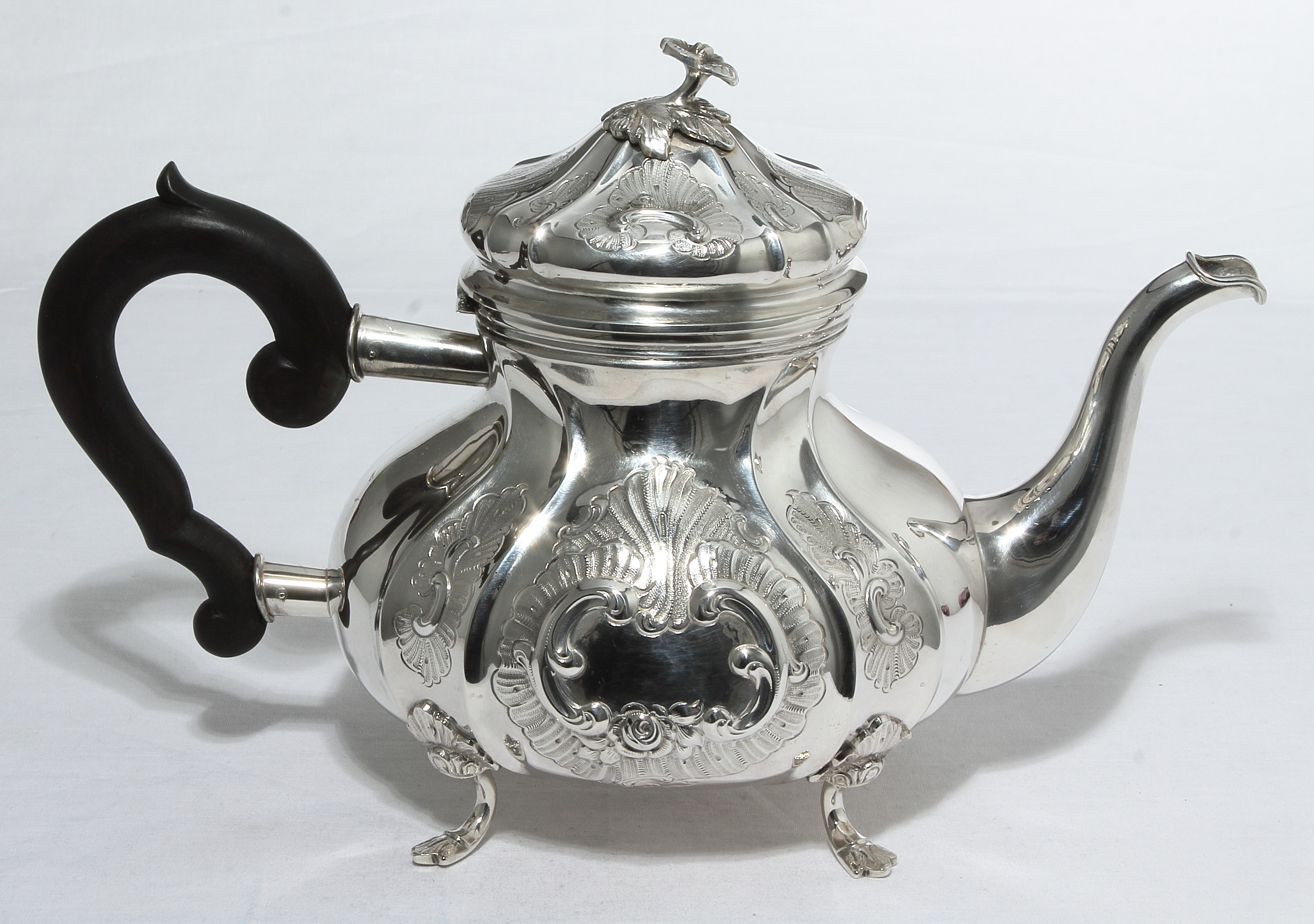 В данном лоте предлагается серебряный чайник в стиле рококо.Чайник установлен на ножки, в местах крепления декорированные рельефными пальметтами.ифленые прямыми гранями бока изделия украшают рельефные рокайли.учка на крышке чайника выполнена в виде объемного цветка.