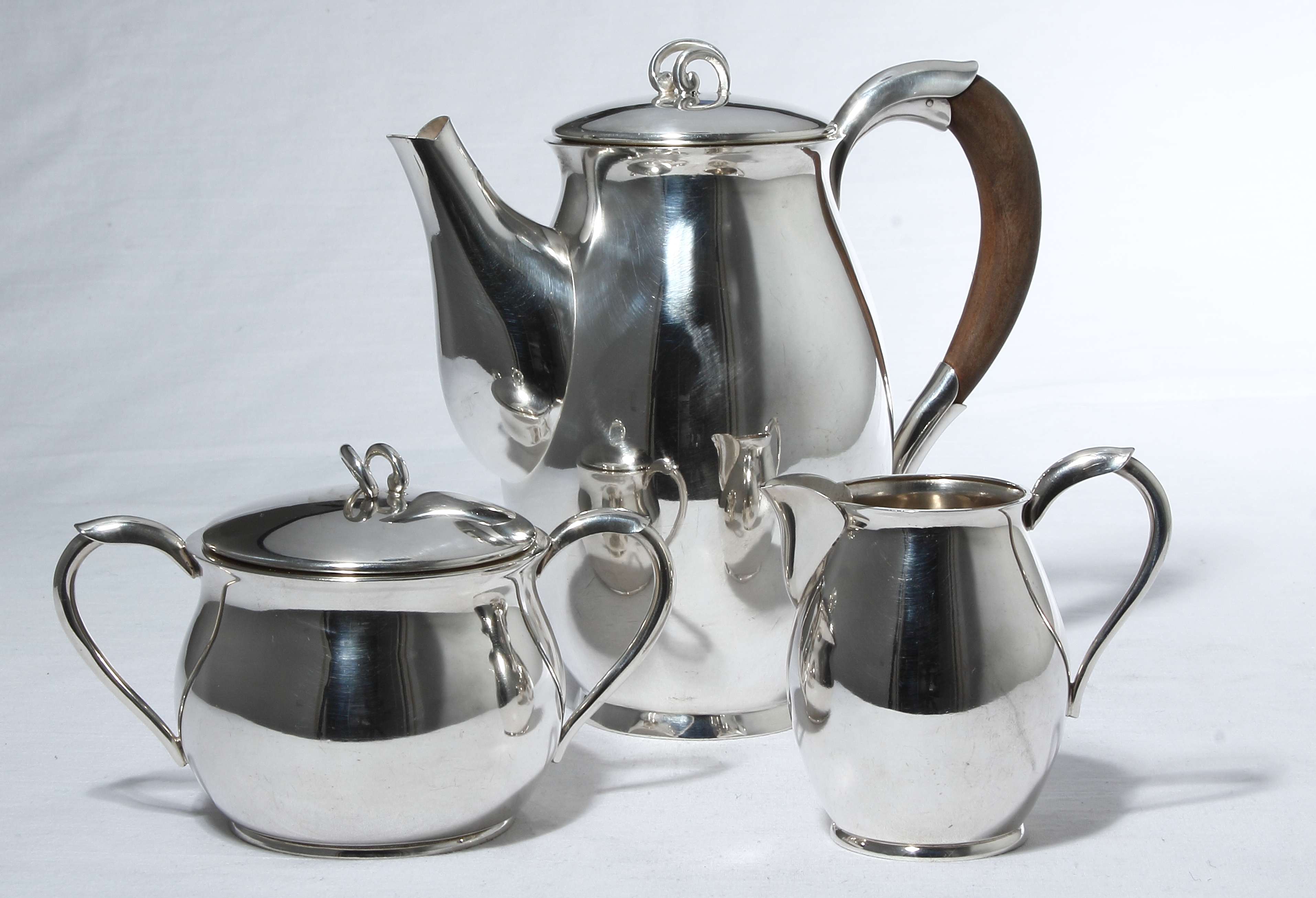Швеция, середина ХХ века.Кофейник: высота по ручку крышки – 17см.Сахарница: высота по ручку крышки - 8см.Молочник: высота по носик – 8см.Общий вес изделий – 727 граммов серебра 925 пробы.