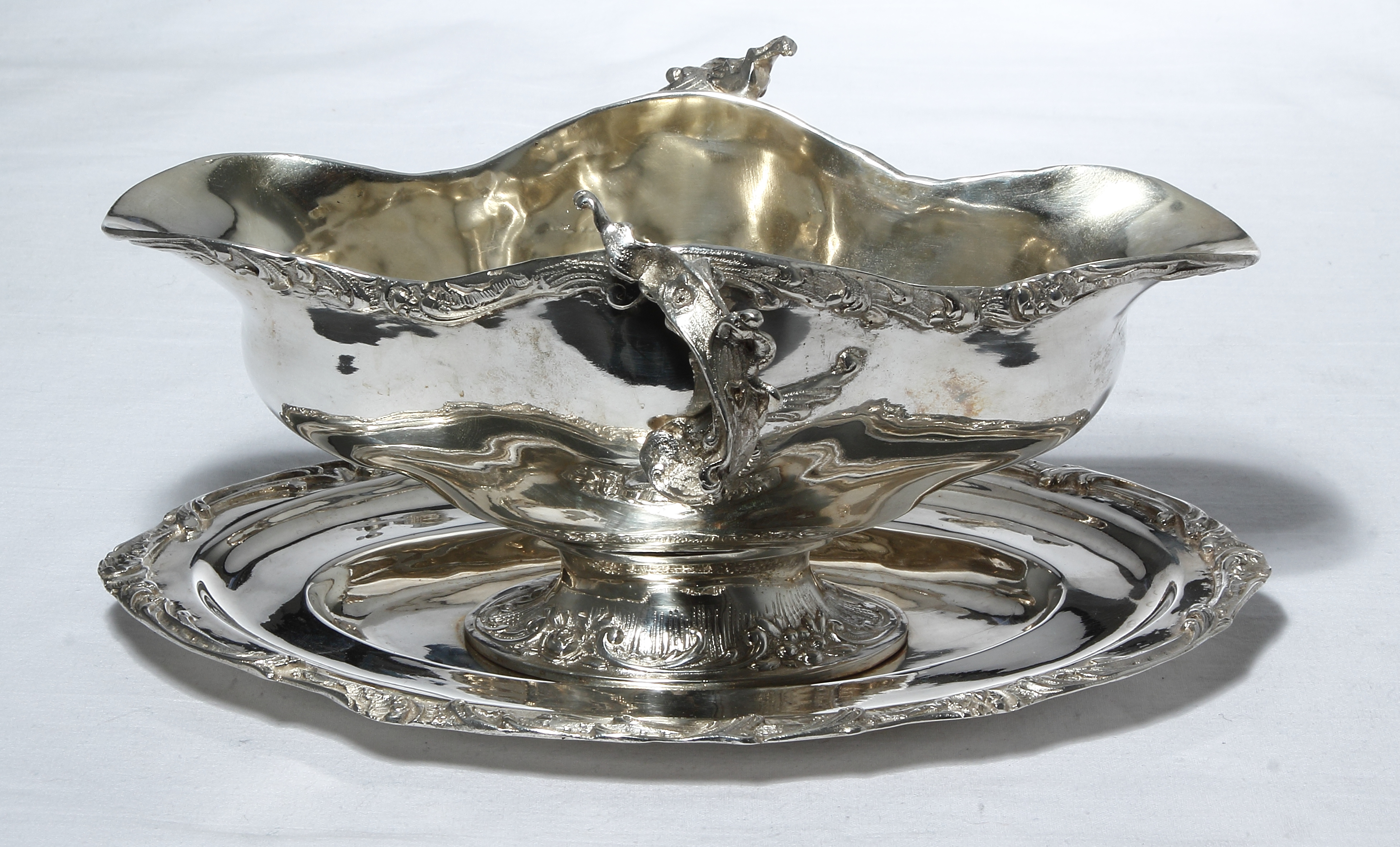 В данном лоте предлагается красивый соусник на подставке, выполненный в стиле рококо.