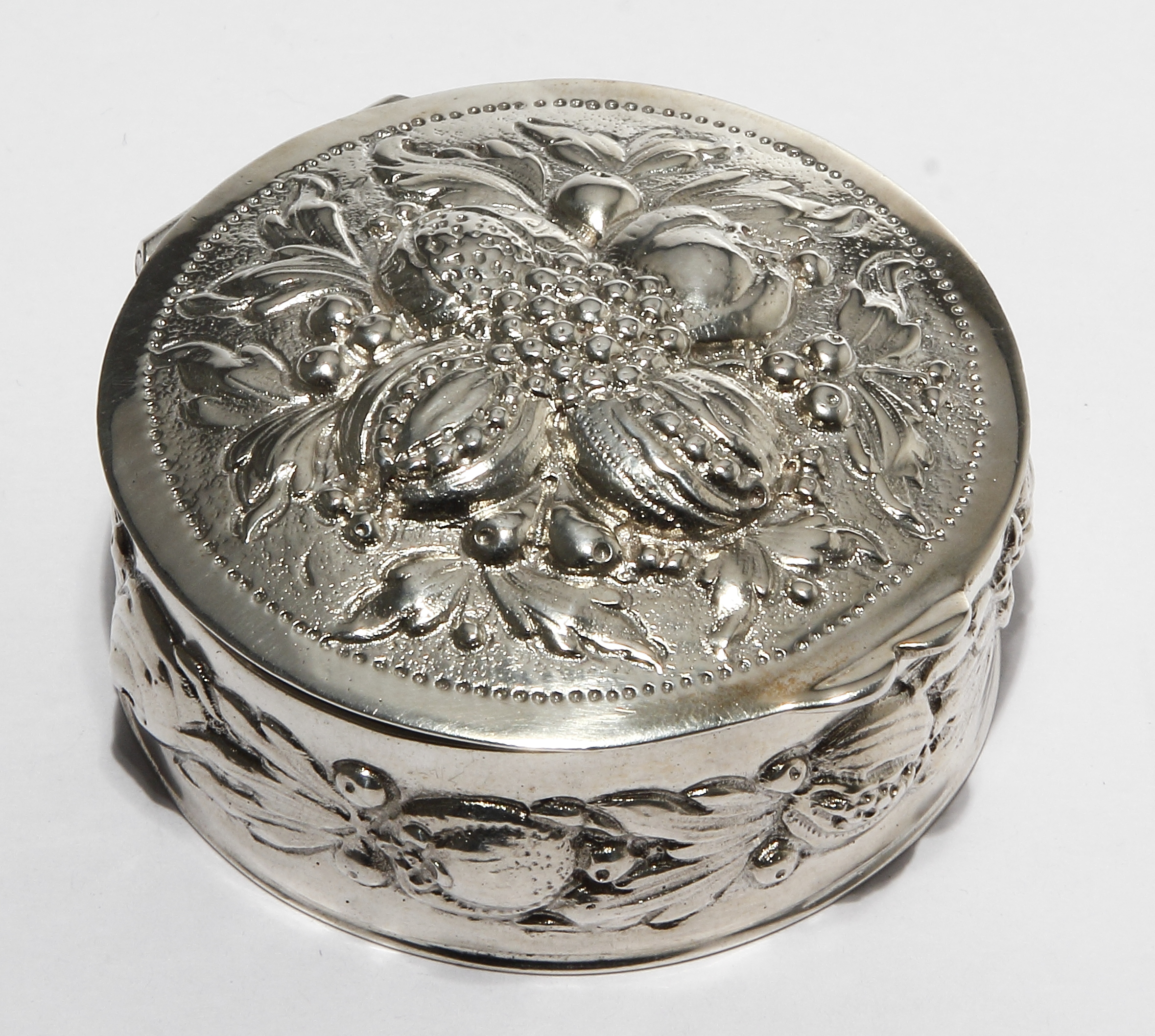 |  |  |  | Бока и крышка шкатулочки декорированы богатым рельефным узором из крупных плодов, цветов и листьев. Внутренняя поверхность изделия позолочена.