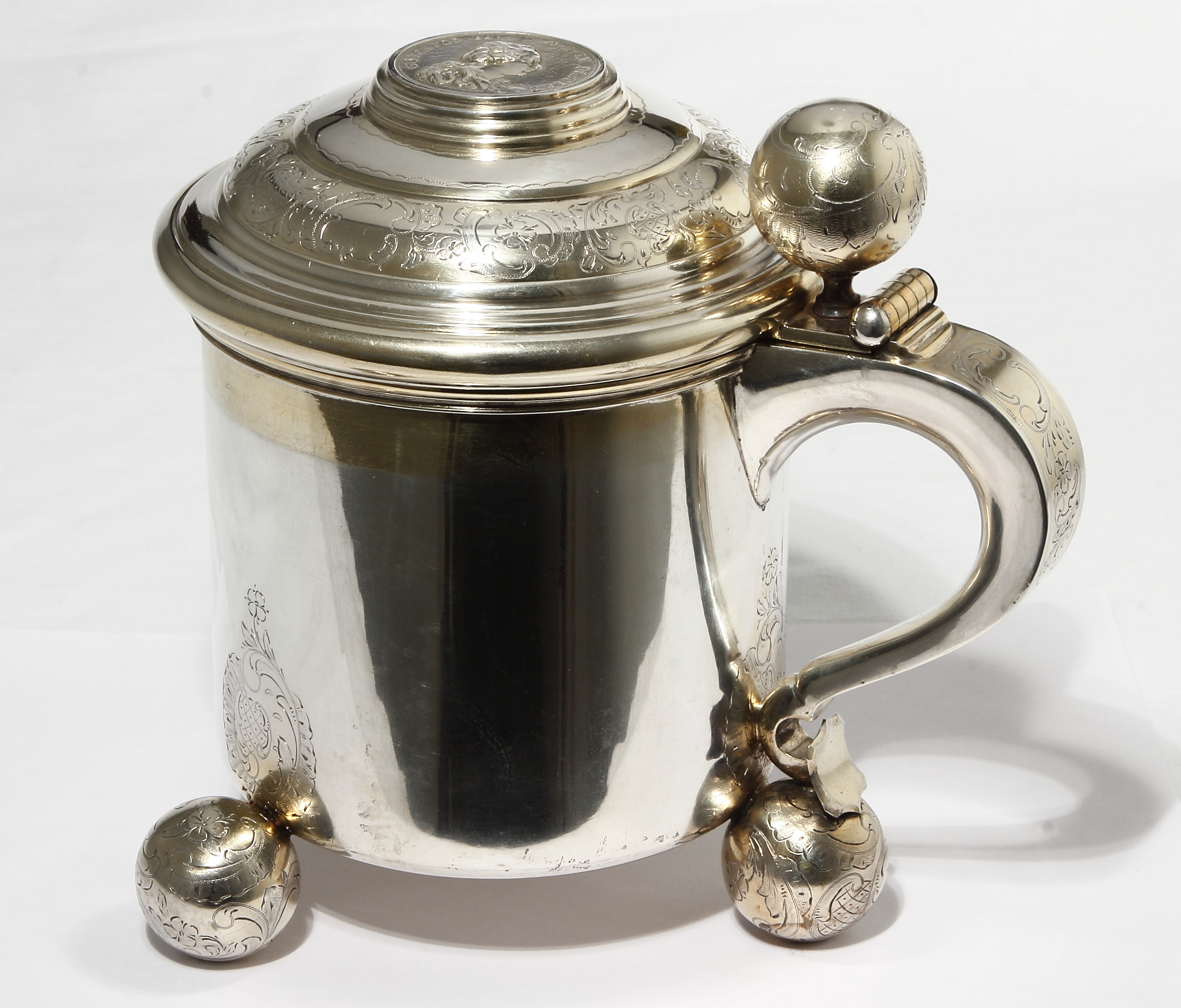 В данном лоте предлагается серебряная пивная кружка с откидной крышкой.