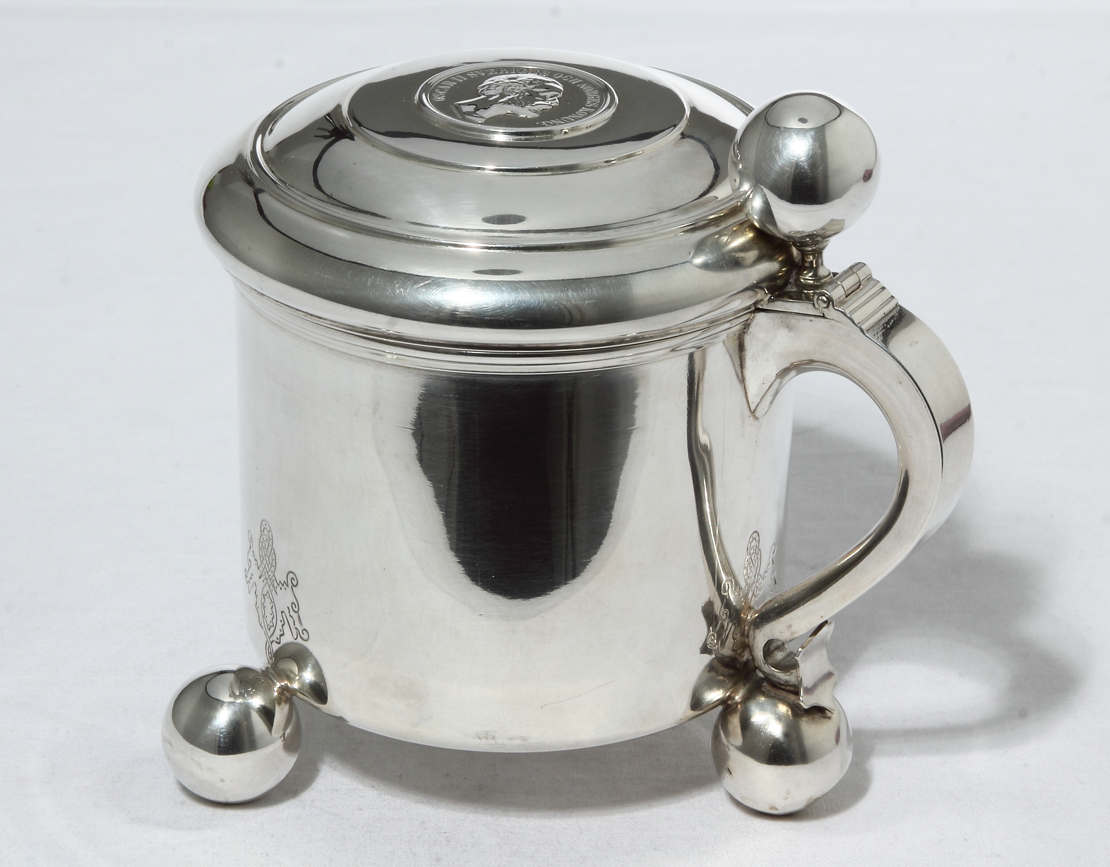 В данном лоте предлагается серебряная пивная кружка с откидной крышкой.
