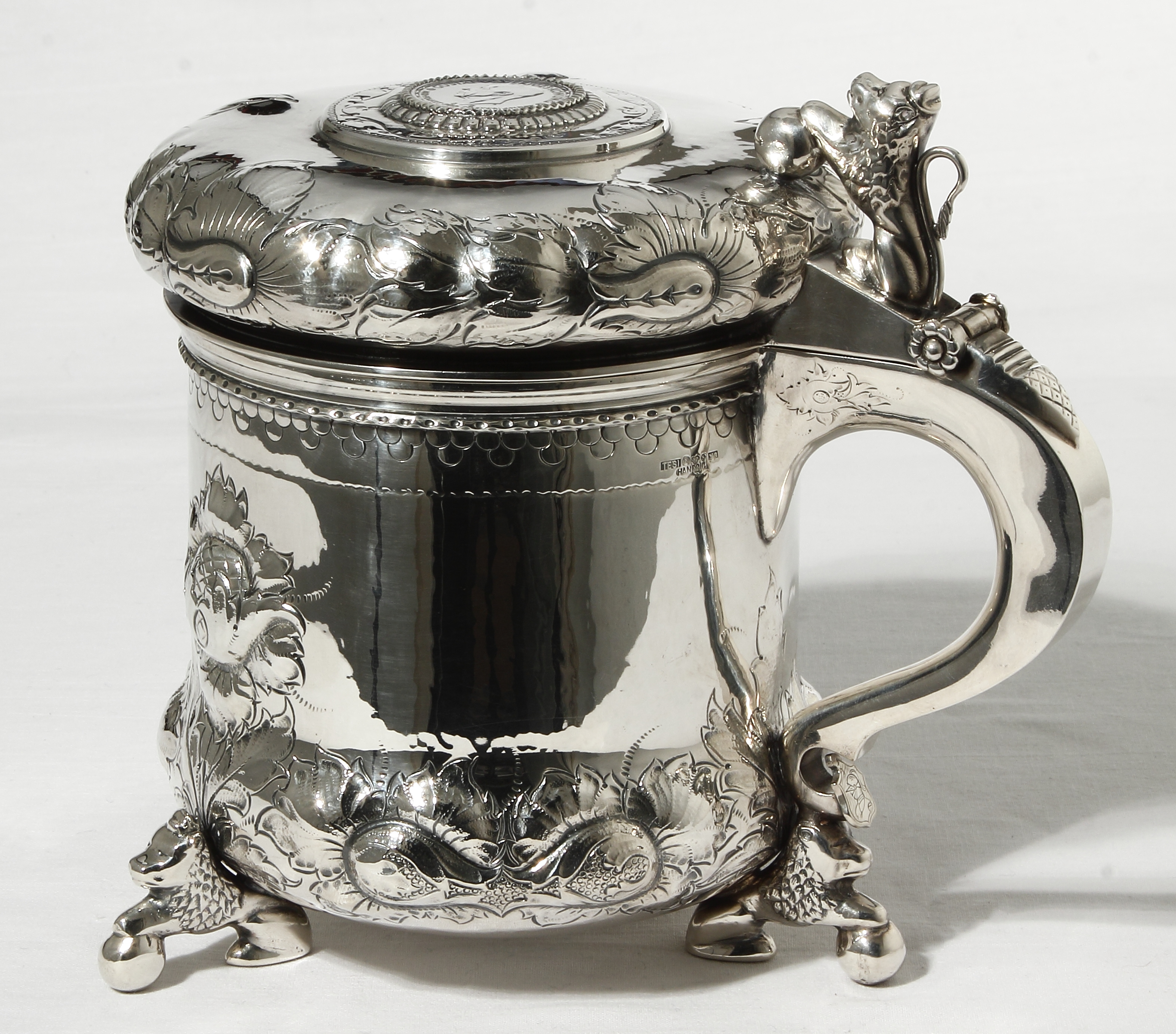 В данном лоте предлагается большая пивная кружка, богато декорированная в барочном стиле.