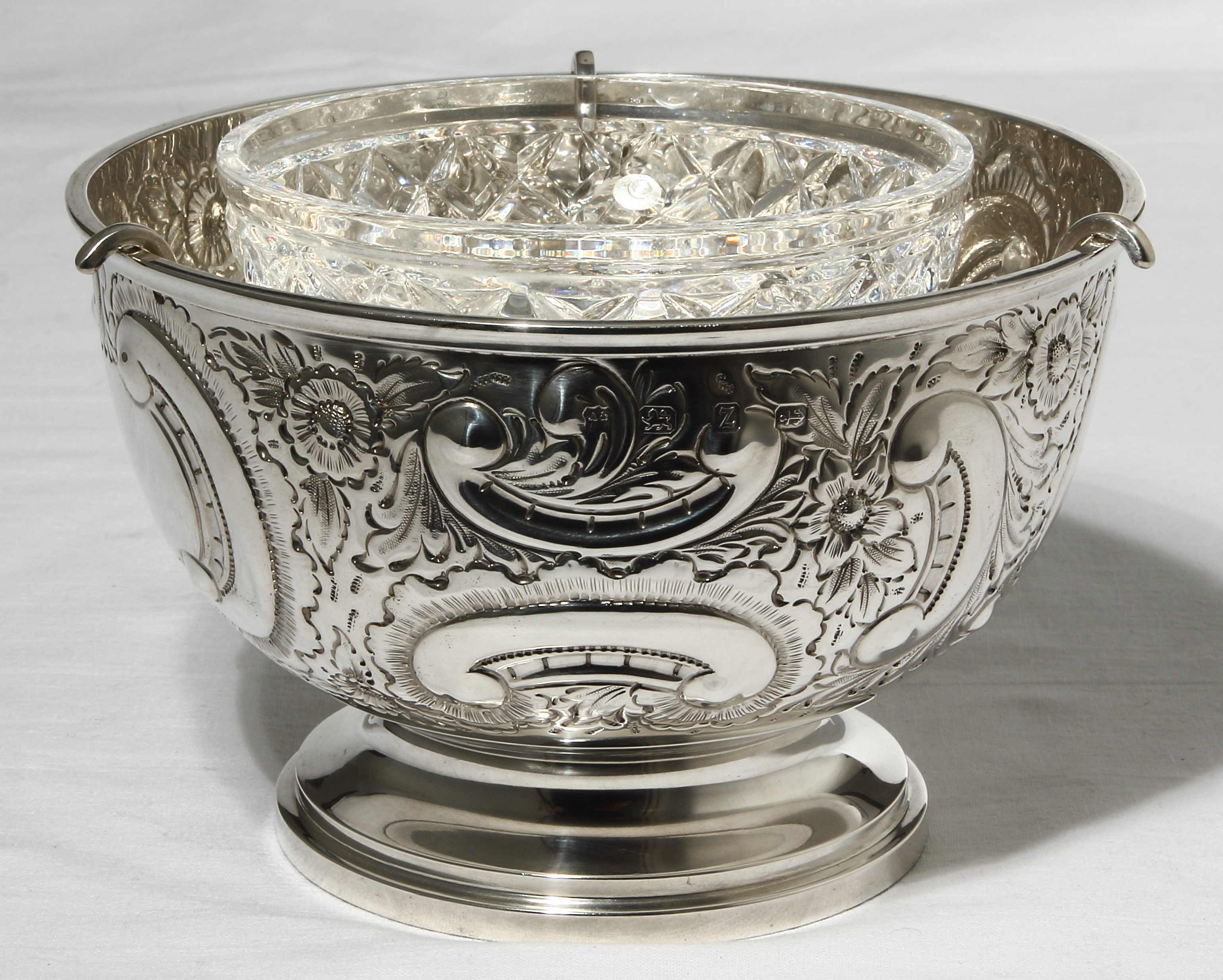 Держатель хрустальной вазочки не имеет пробирных клейм, но однозначно выполнен из серебра.