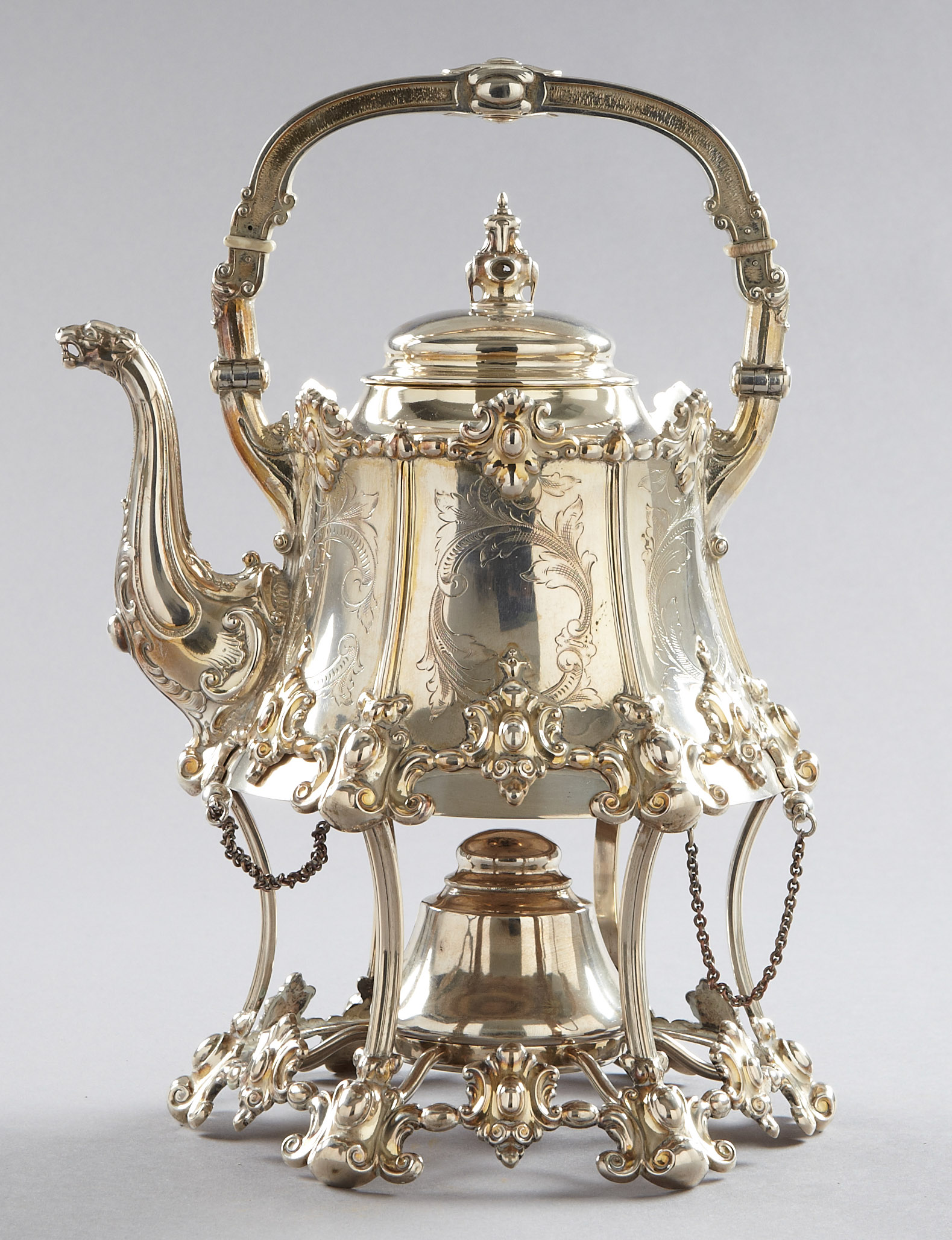 В данном лоте предлагается шикарная серебряная бульотка - чайник с горелкой.