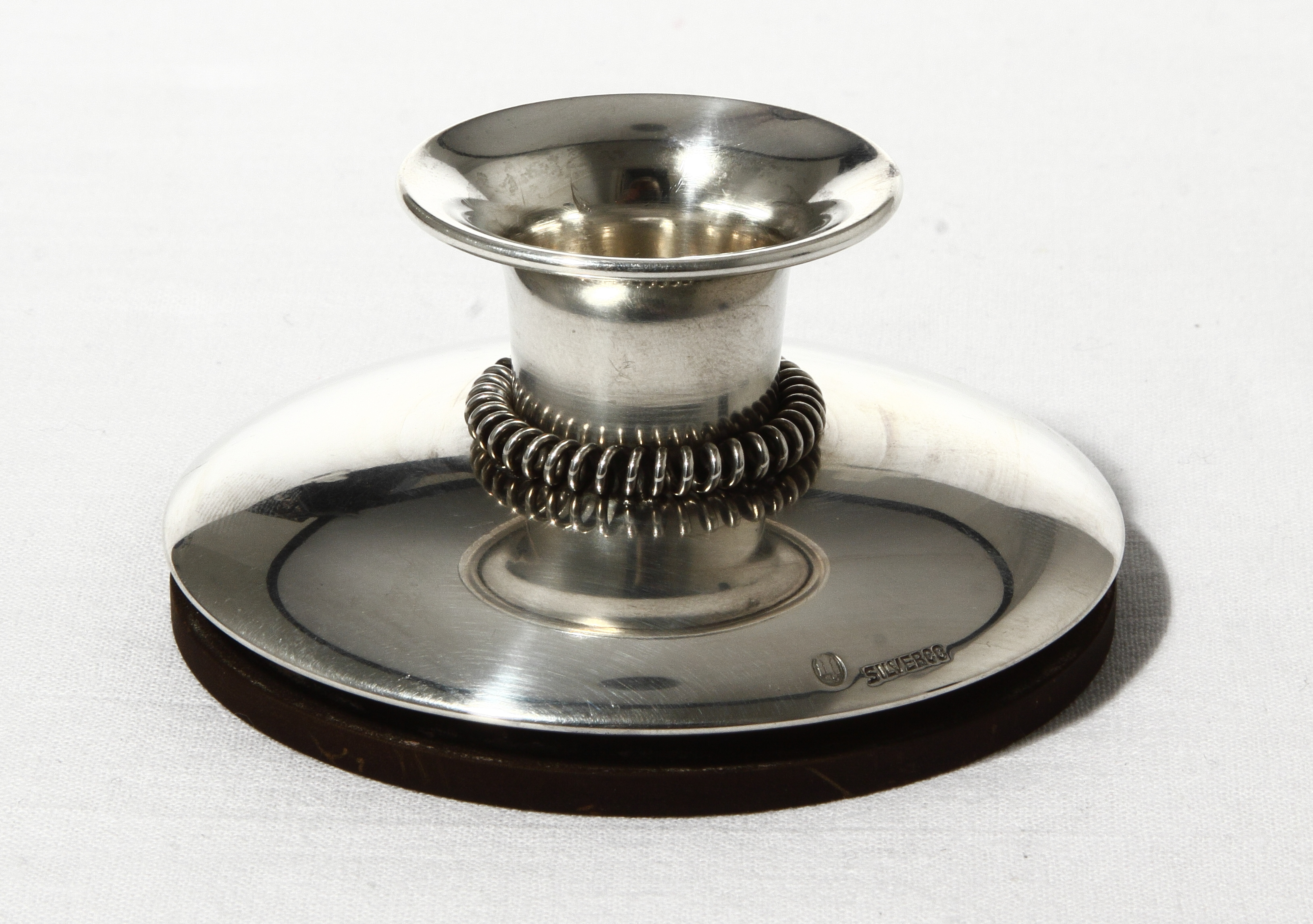 Высота - 3,8см, диаметр основания - 7,7см, диаметр отверстия для свечи - 2,3см. Вес - 85 граммов, включая бакелитовую подставку. Серебро не ниже 826 пробы.